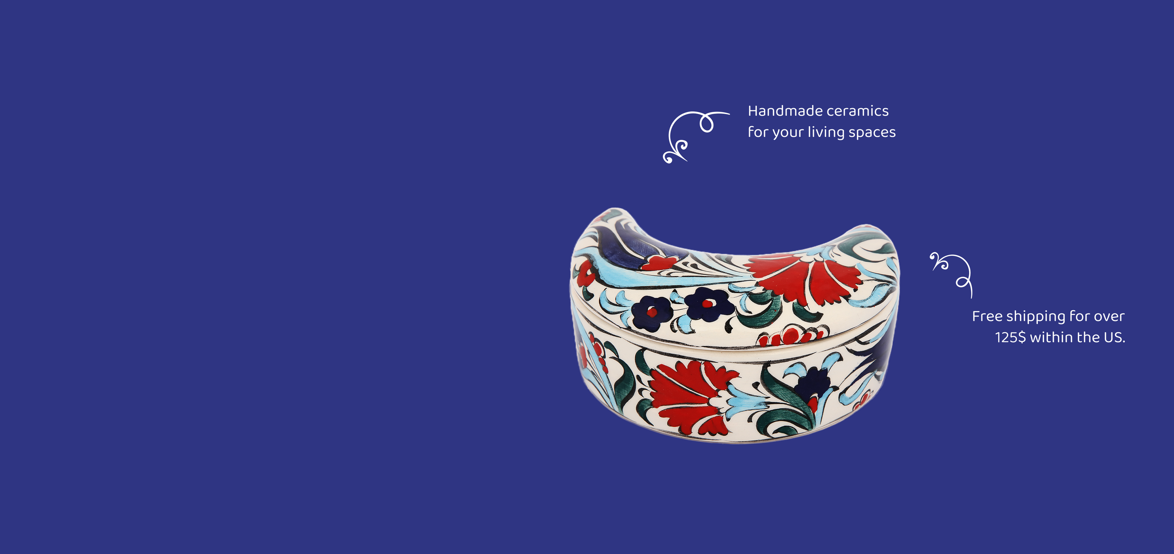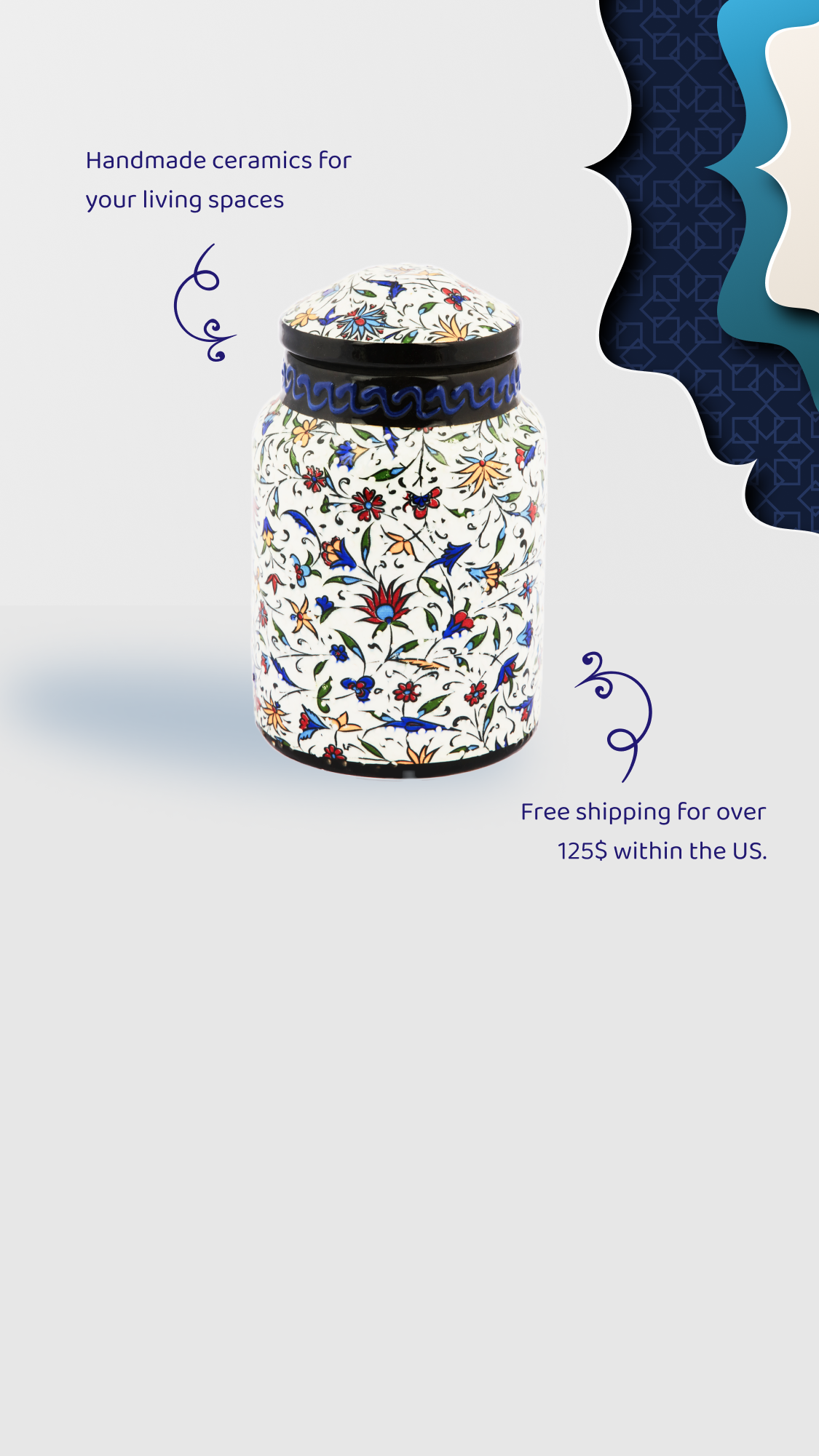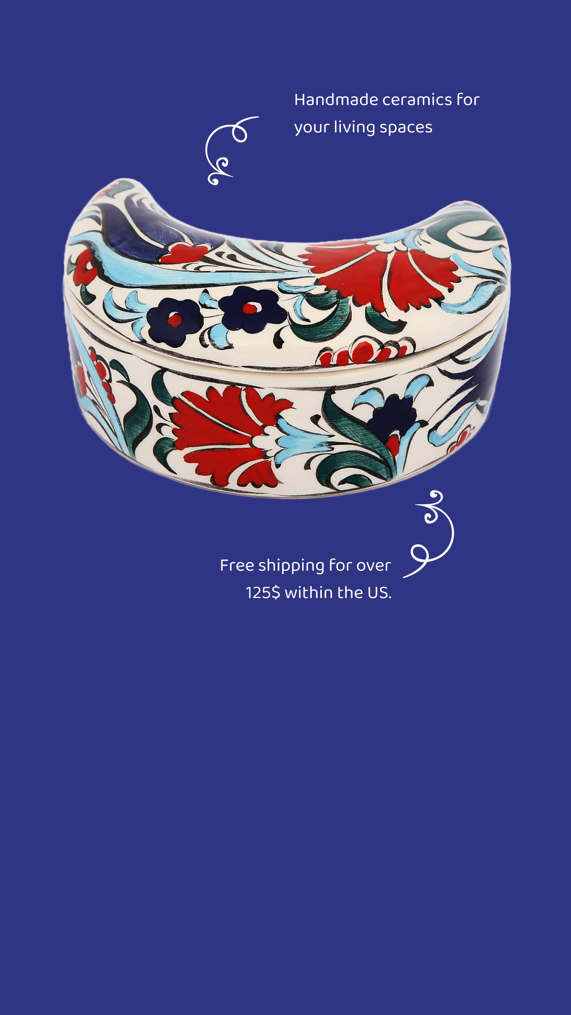 Behold the 'Ottoman Florals' Hand-Painted Ceramic Box, a regal addition to our artisan collection. This exquisite piece is handcrafted with a smooth ceramic finish, adorned with a symphony of floral artistry in a rich palette of blues, reds, and greens. The intricate patterns, inspired by the lavish gardens of Ottoman palaces, wrap around the box in a seamless flourish of elegance. Topped with a distinctive golden handle that adds a touch of opulence, this box is perfect for safeguarding your treasured mementos or gracing any space with its majestic presence.Regular price $24.99Sale price $24.99 Regular priceUnit price per -