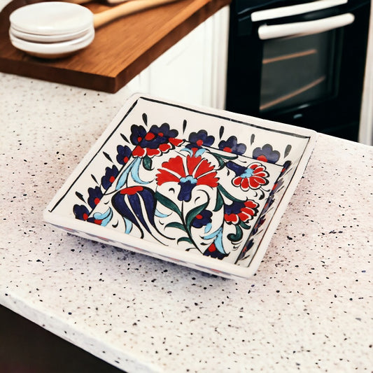 Introducing the Handmade Ceramic Blossom Breeze Square Bowl, a stunning piece that perfectly encapsulates the delicate artistry of traditional ceramics. Each bowl is meticulously handcrafted, ensuring that no two pieces are exactly alike. The Blossom Breeze design features a vibrant mix of red and blue floral patterns that are beautifully contrasted against the pristine white background, evoking the feeling of a gentle spring breeze sweeping through a blooming garden.The deep and rich blue outlines the edges and contours of the bowl, providing a bold frame for the intricate floral design within. Pops of red bring a dynamic energy to the piece, while softer shades of blue add depth and sophistication. This square bowl, with its slightly raised edges, is as functional as it is decorative, perfect for serving or as a statement piece in your home decor.Crafted with care from high-quality ceramic, this bowl is durable and suitable for everyday use. Its versatile size makes it ideal for a variety of uses, from holding fruit on the countertop to serving a special dish at the dinner table. The Handmade Ceramic Blossom Breeze Square Bowl is a testament to the timeless beauty of hand-painted ceramics, offering a touch of elegance and charm to any setting."Regular price $29.99Sale price $29.99 Regular priceUnit price per -