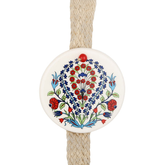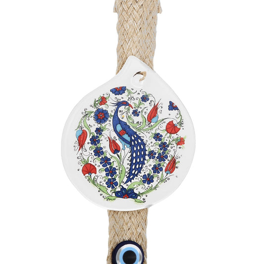 This is the "Mystical Peacock Medallion" – a ceramic hanging ornament that exudes elegance and cultural beauty. It is a circular disc elegantly painted with a pair of peacocks in vibrant blue and green hues, their plumage elegantly intertwined and surrounded by lush floral motifs in red and green, reminiscent of traditional Ottoman designs.
