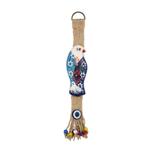 The top of the ornament is affixed with a natural-colored braided jute rope, secured with a metal ring for easy hanging. The lower portion cascades into a tassel of jute strands, each adorned with an array of brightly colored beads, and is punctuated by an evil eye bead believed to ward off negativity.