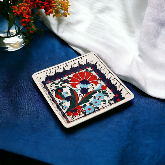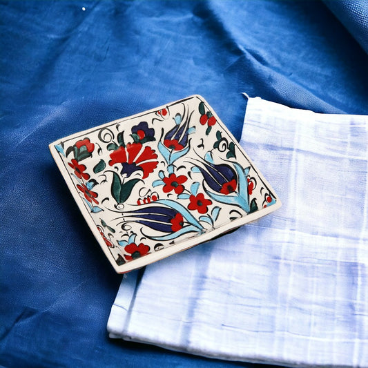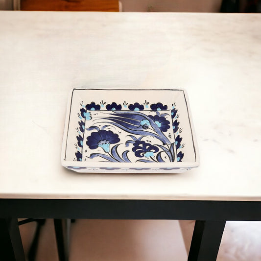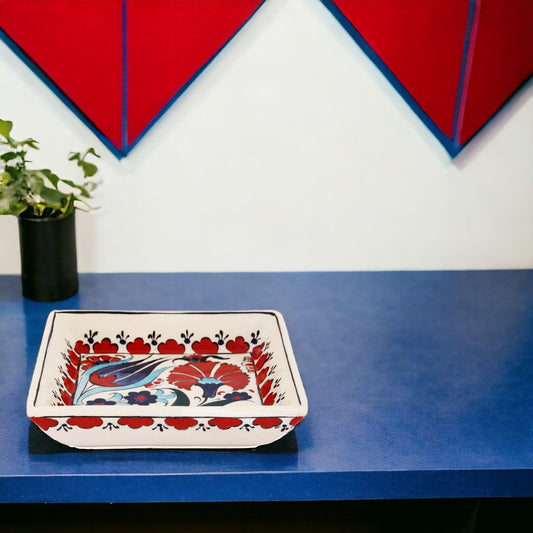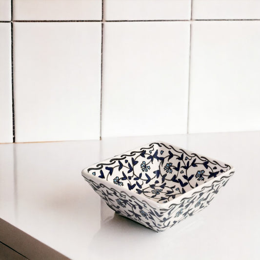 Introducing the Handmade Ceramic Blue Flora Square Bowl- a timeless piece of functional art for your home. This exquisite bowl showcases a captivating floral pattern in rich shades of blue, accented with subtle touches of red and turquoise, reminiscent of classic Iznik designs. Each bowl is meticulously handcrafted, ensuring a unique piece with slight variations that add to its charm and character.The square silhouette gives a modern twist to the traditional craftsmanship, making it an ideal choice for contemporary and eclectic settings. Whether you're serving a delicious meal or displaying it as a centerpiece, this bowl is food safe and adds a splash of elegance to any table. Perfect for those who appreciate artisanal beauty, this bowl is not only a functional kitchenware item but also a statement piece that celebrates the timeless allure of hand-painted ceramics.Regular price $29.99Sale price $29.99 Regular priceUnit price per -