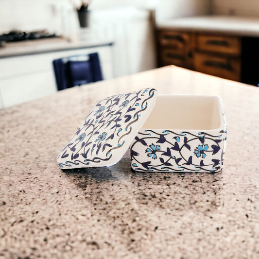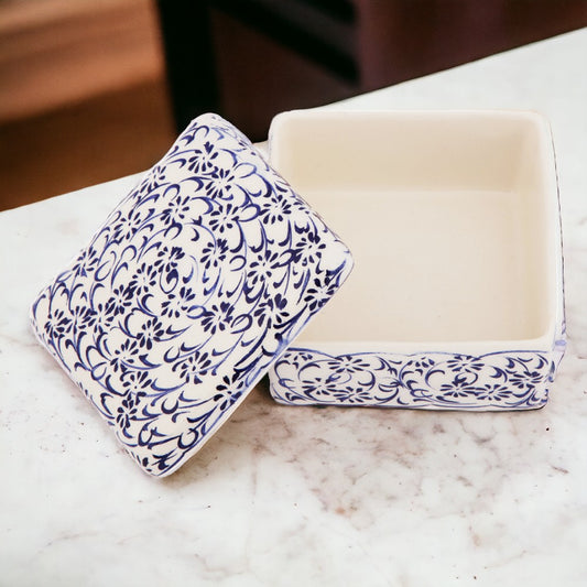 Behold the 'Sapphire Meadow' Handmade Ceramic Box, a harmonious blend of art and storage. Each box is lovingly adorned with a floral motif in sapphire blue hues, accented with sky blue touches, evoking the feel of a serene wildflower field under a clear sky. The deep blue patterns are hand-painted with precision, set against the clean white of the ceramic, showcasing the unparalleled skill of the artisans. This box is not only a nod to traditional craftsmanship but also an elegant solution for keeping your treasures safe, ensuring each piece is as unique as it is beautiful.Regular price $29.99Sale price $29.99 Regular priceUnit price per -