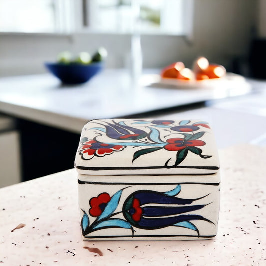 Introducing the 'Cerulean Harmony' Handmade Ceramic Trinket Box, a small square keepsake box that brings the artisan's touch to your treasures. The vibrant, hand-painted design features bold cerulean and deep navy flowers, accented with bright red details, creating a lively contrast against the clean white ceramic. This box is a celebration of traditional techniques, with each brush stroke and color carefully applied to create a harmonious design that's both eye-catching and elegant. Its compact size makes it perfect for storing your precious items with a touch of handcrafted beauty.Regular price $29.99Sale price $29.99 Regular priceUnit price per -