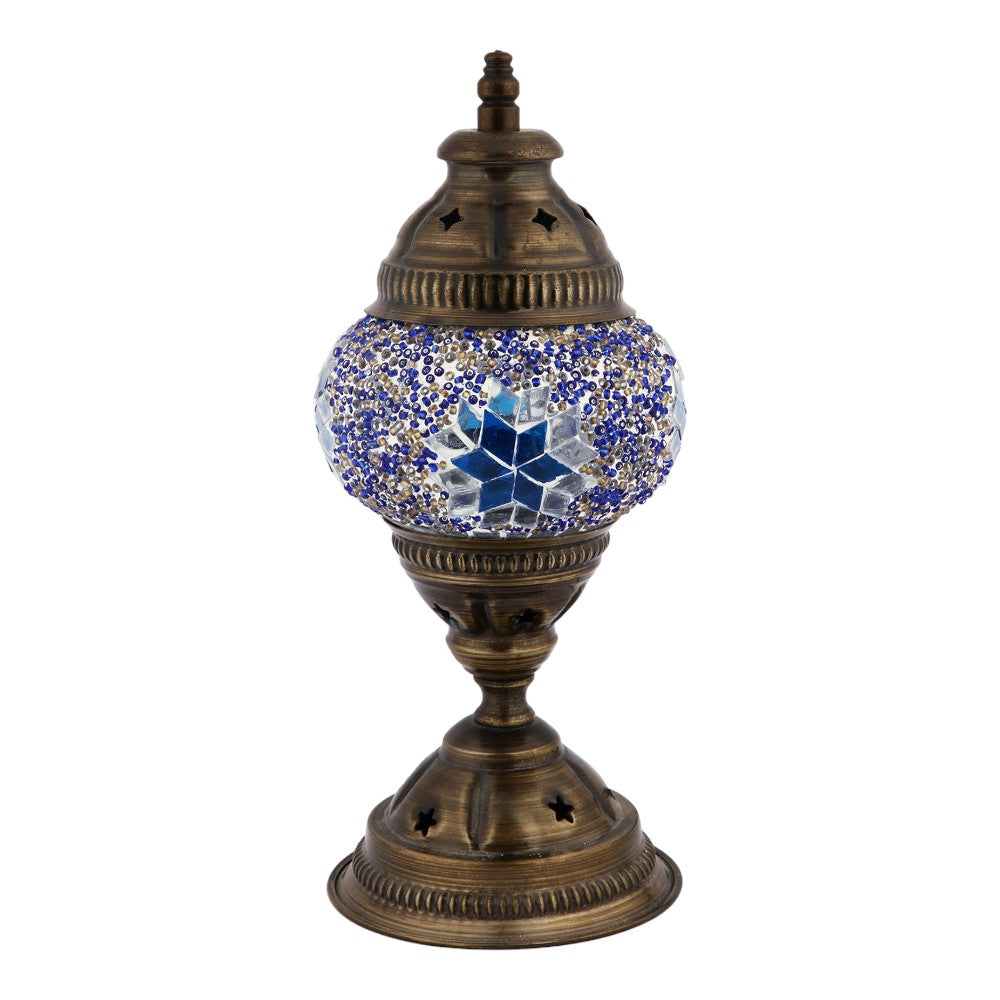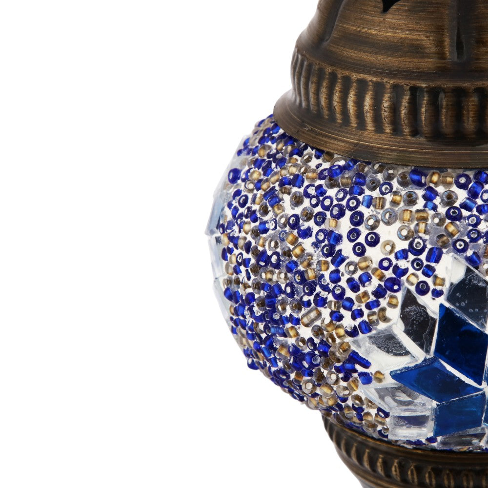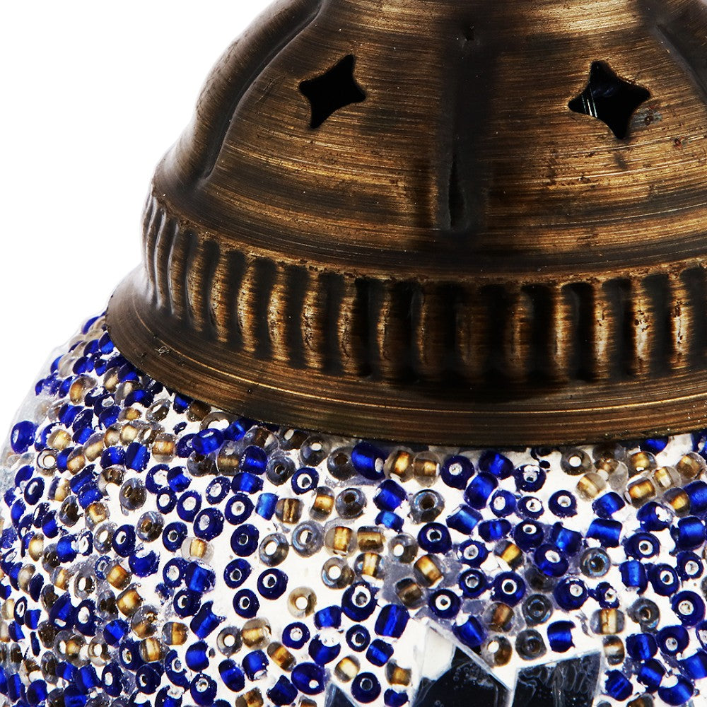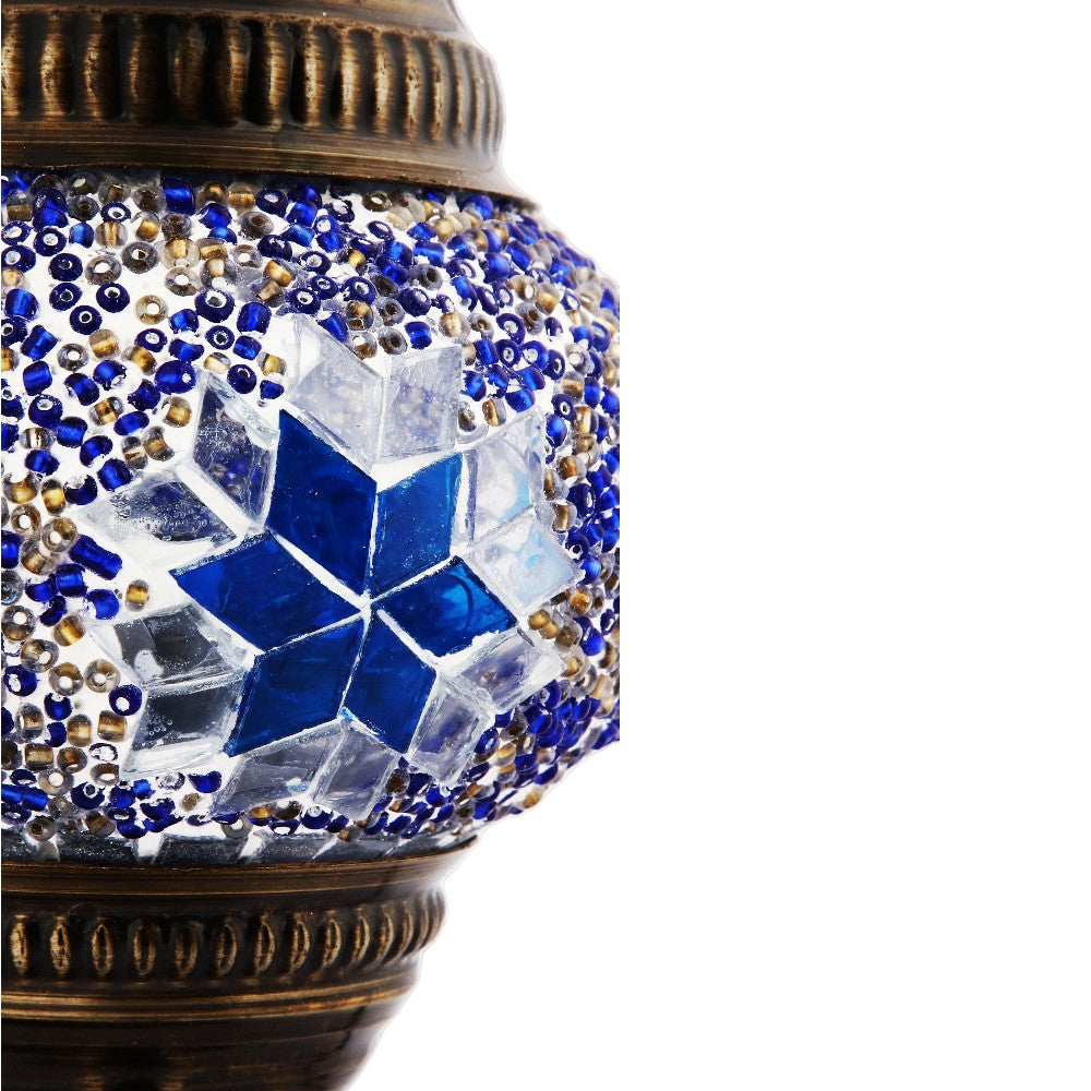 Embrace the allure of the 'Celestial Mosaic Luminary,' an exquisite piece where traditional craftsmanship meets ethereal design. This ornate lamp features a globe of hand-placed glass mosaics in a constellation of blu...