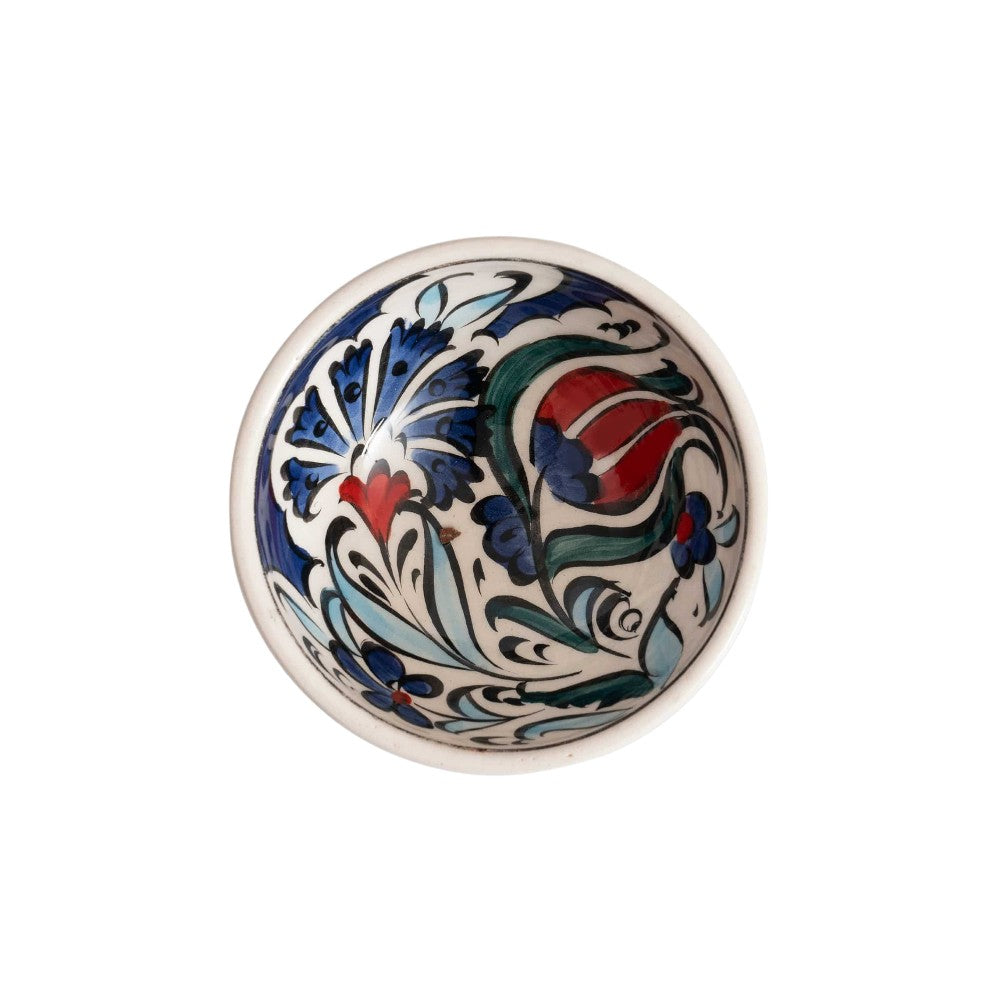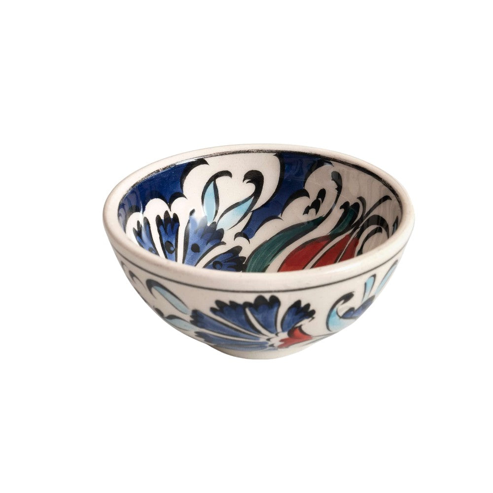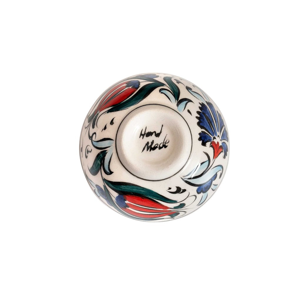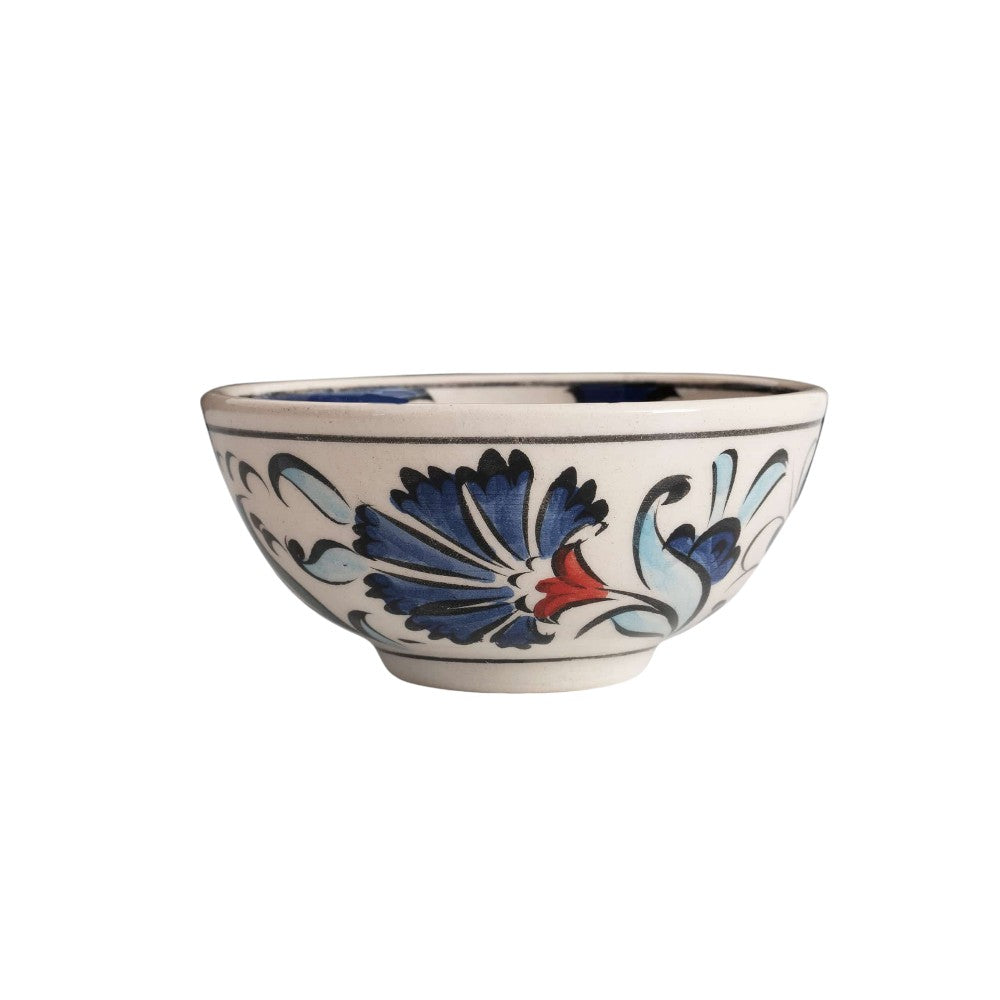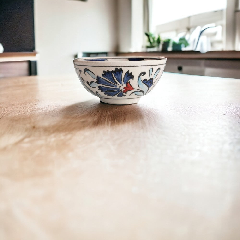 This elegant bowl is a testament to timeless artistry, featuring a striking blend of traditional blue and red floral motifs delicately hand-painted on a cream-colored ceramic backdrop. The bowl's exterior showcases a ...