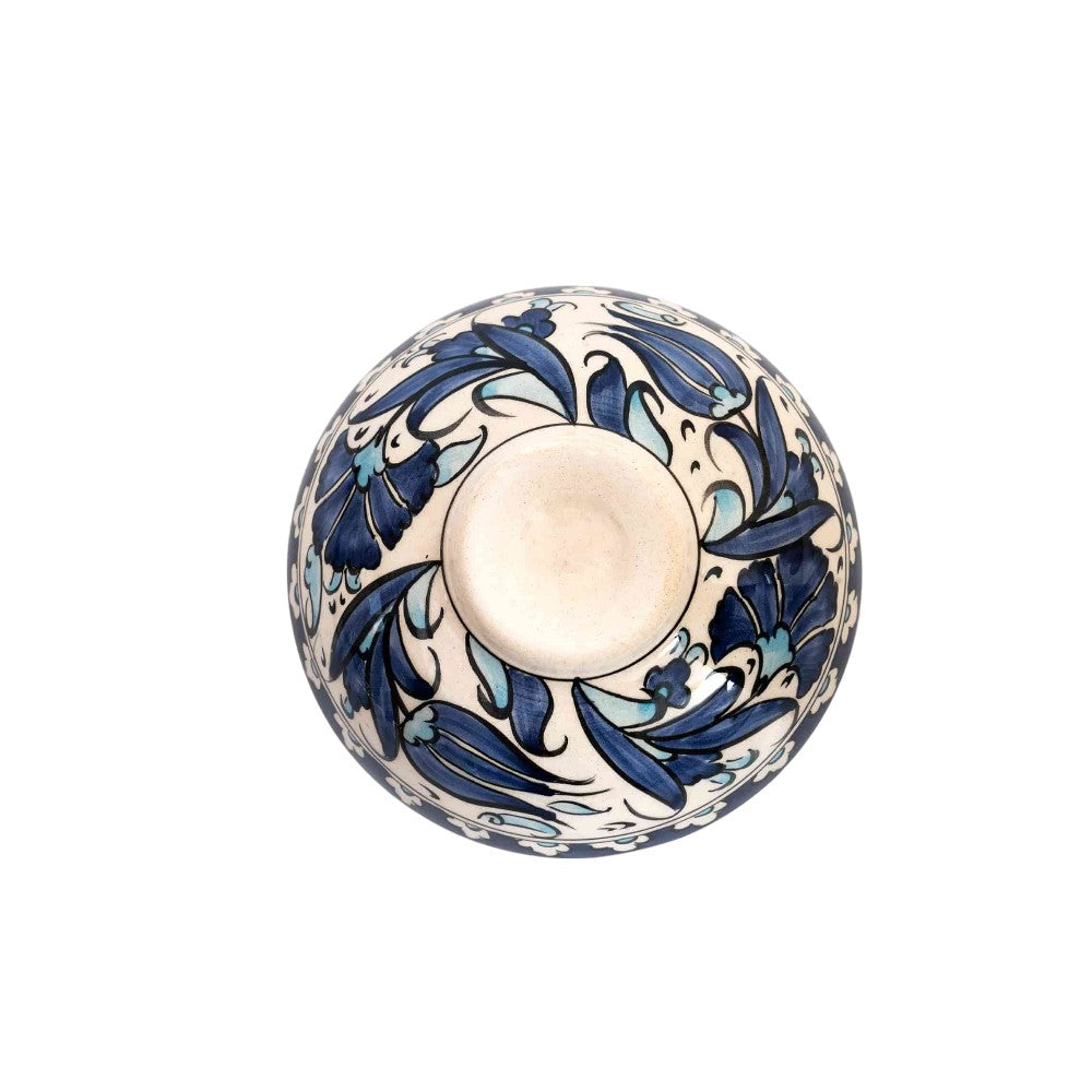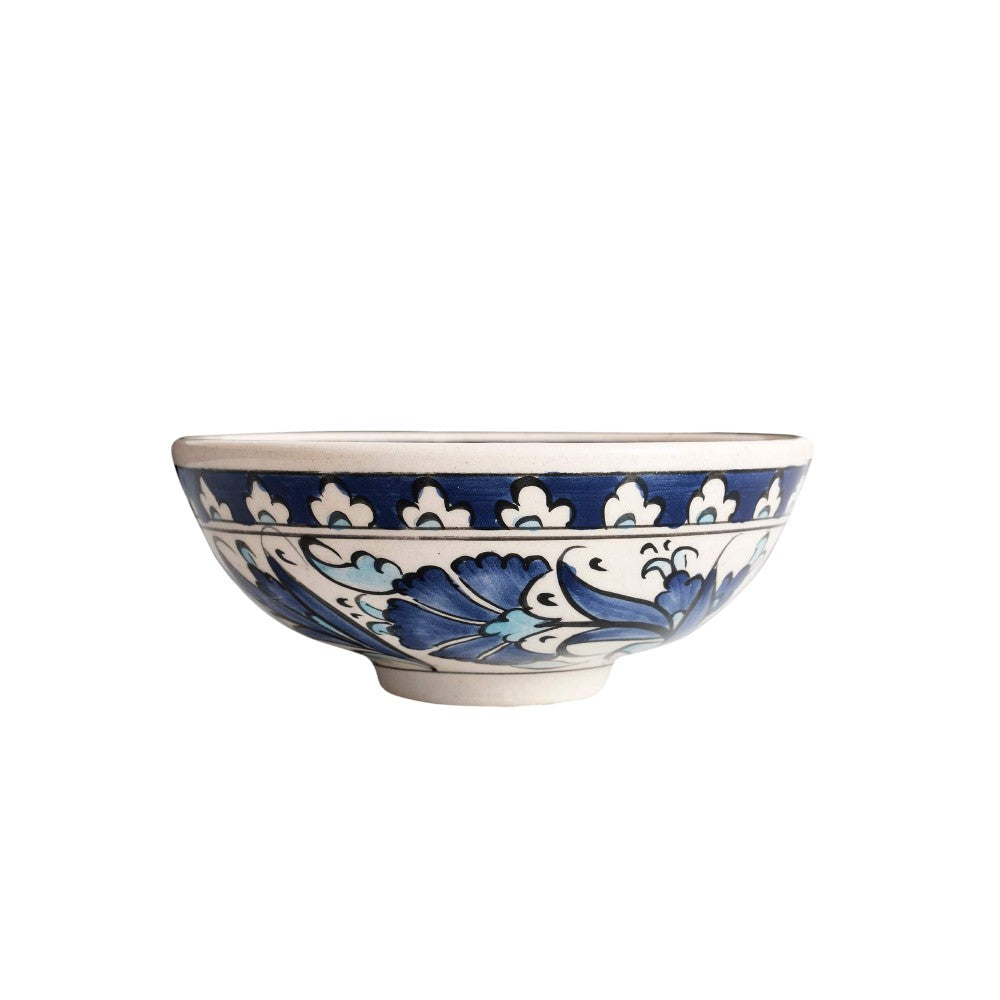 The "Majestic Cerulean Floral Bowl" is a beautifully crafted ceramic piece, adorned with a deep blue floral pattern that cascades across its interior and exterior surfaces. The contrasting white background highlights ...