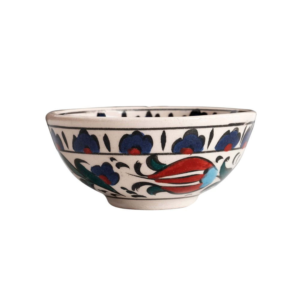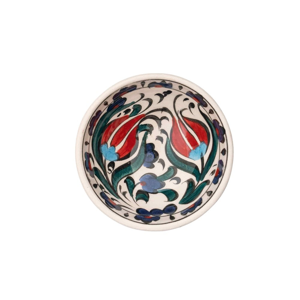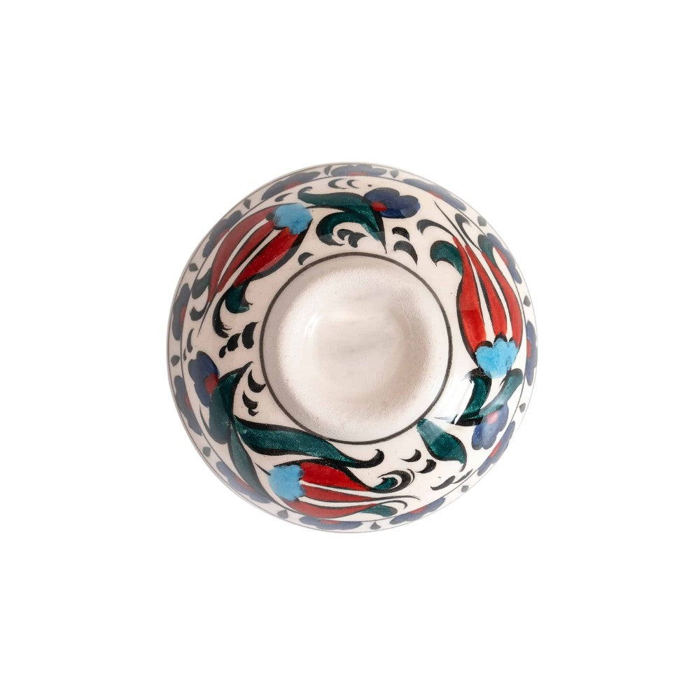 The "Tulip Elegance Ceramic Bowl" is a stunning 3-inch bowl featuring twin tulip motifs in a vibrant dance of red and blue, set against a creamy backdrop. Hand-painted with a flourish of leaves and petals, this bowl c...