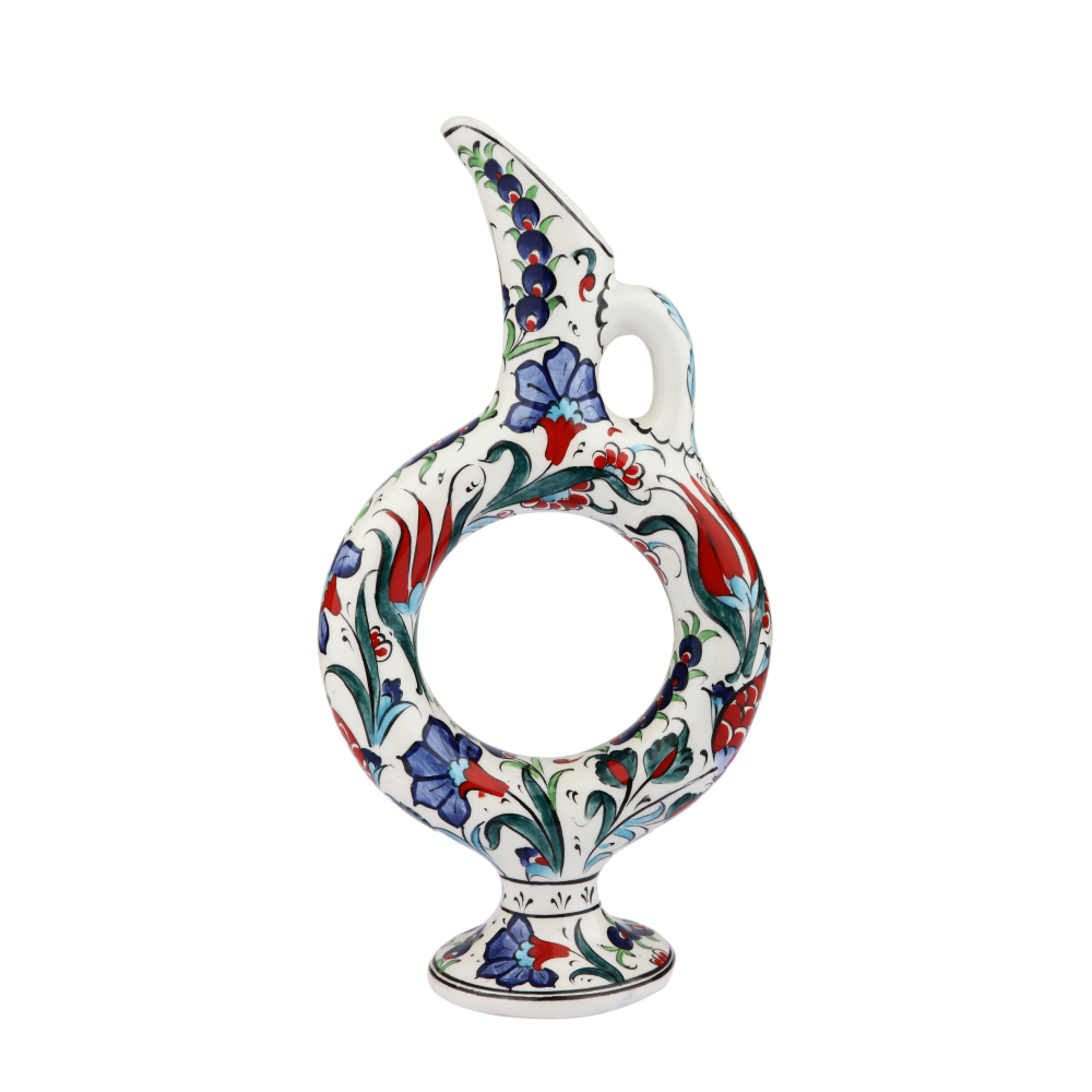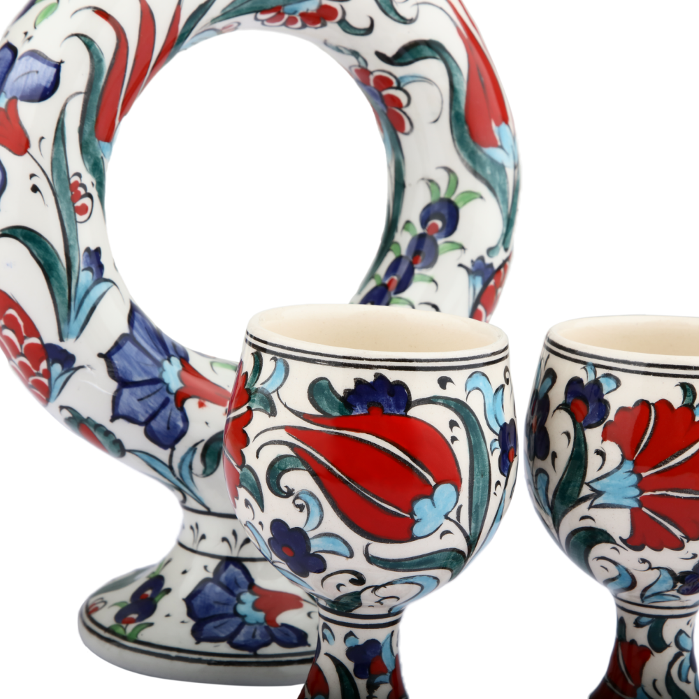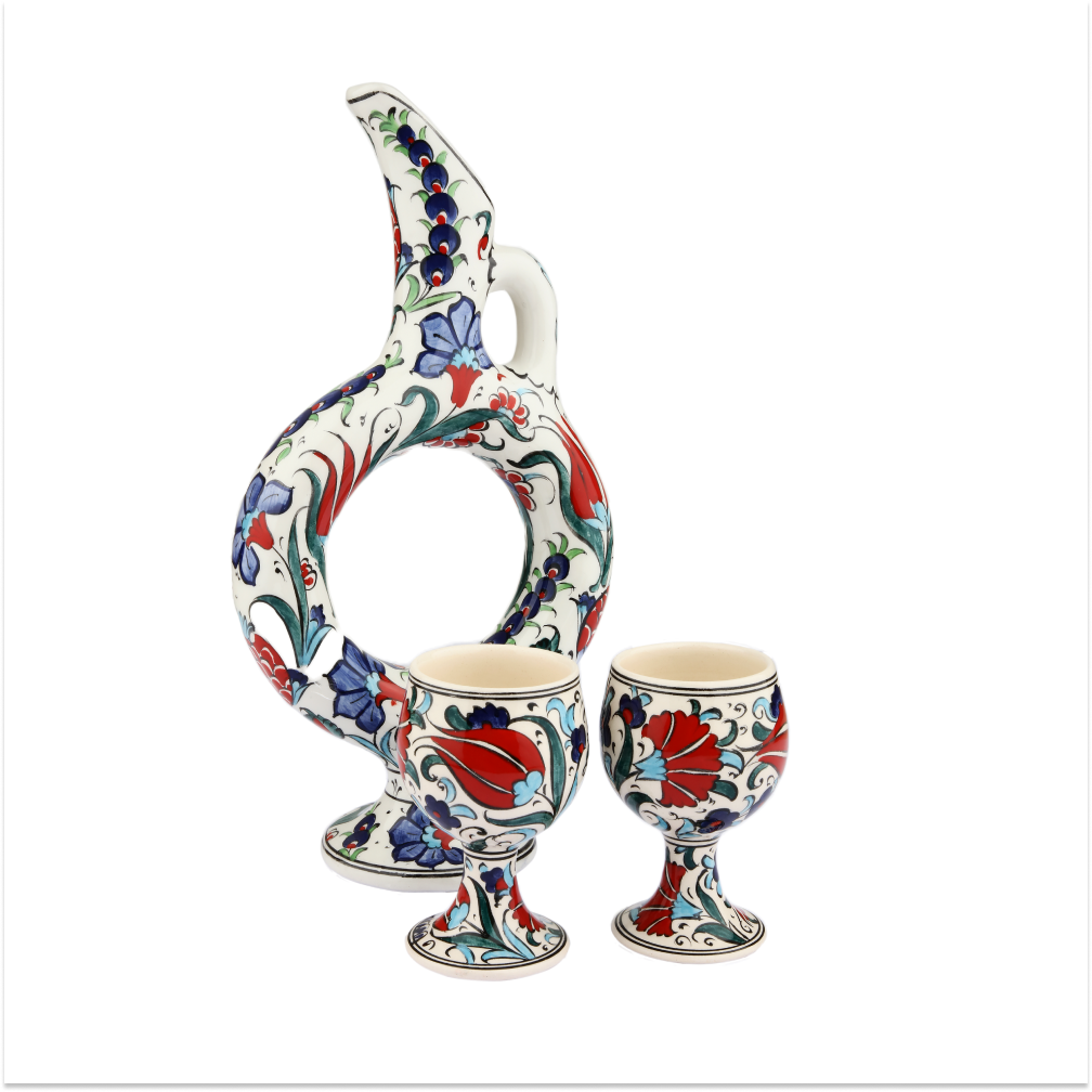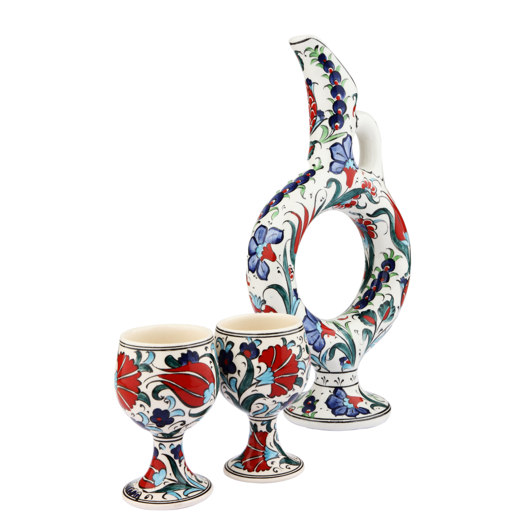 This unique Hittite Vase Set draws inspiration from the rich heritage of Anatolian civilizations. The set features a striking pourer and two goblets, each adorned with traditional motifs in vibrant red, blue, and turq...