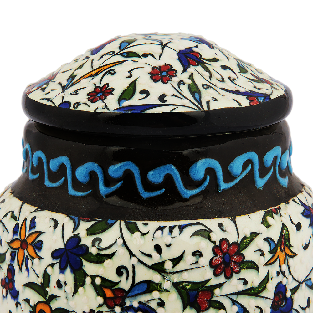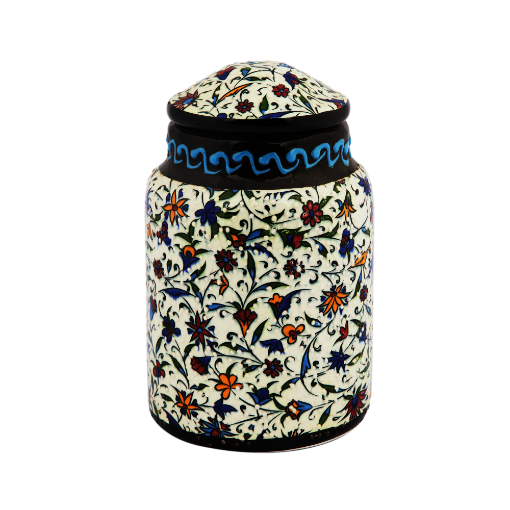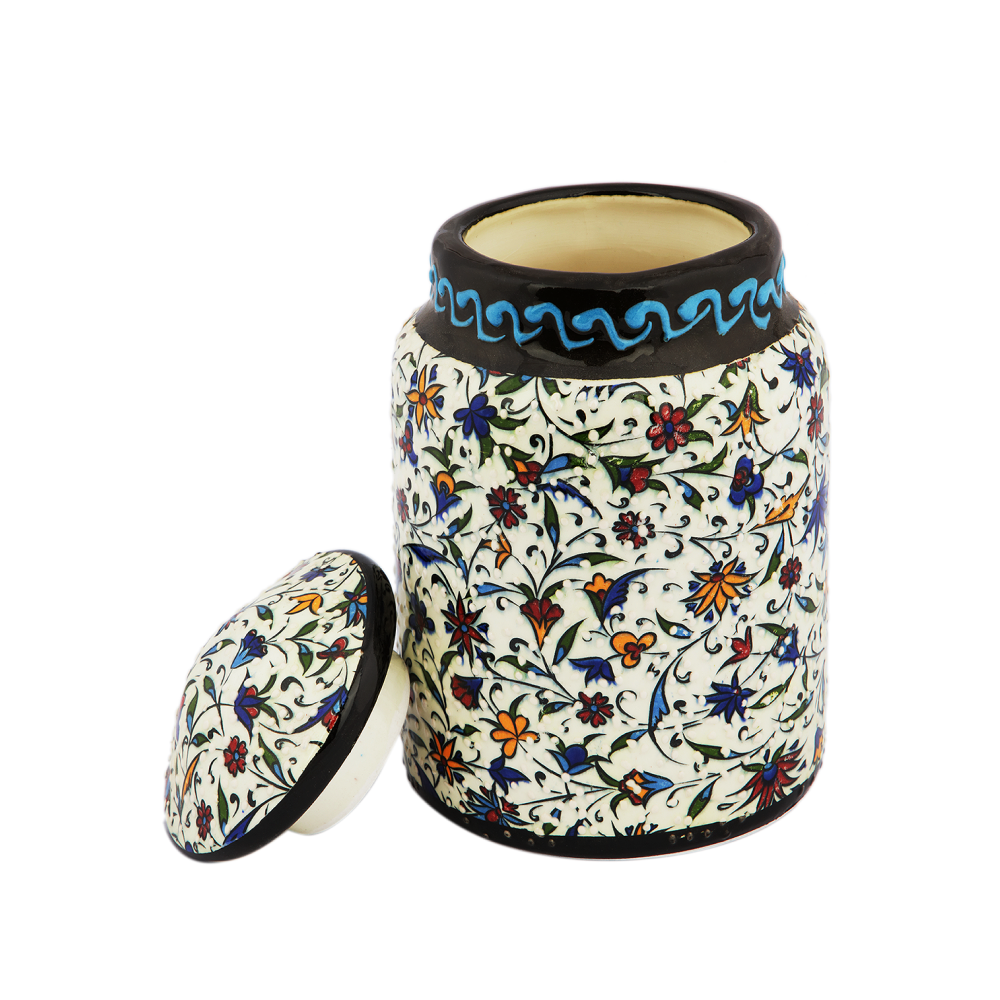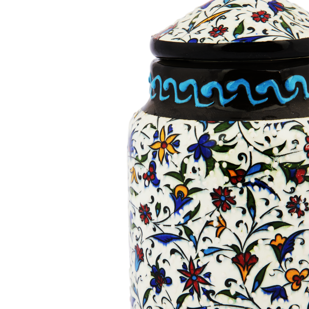 Discover the charm of handcrafted elegance with our Ceramic Floral Jar. Each jar is a canvas of pristine white ceramic, hand-thrown by skilled artisans, and adorned with a vibrant bouquet of hand-painted flowers. The ...