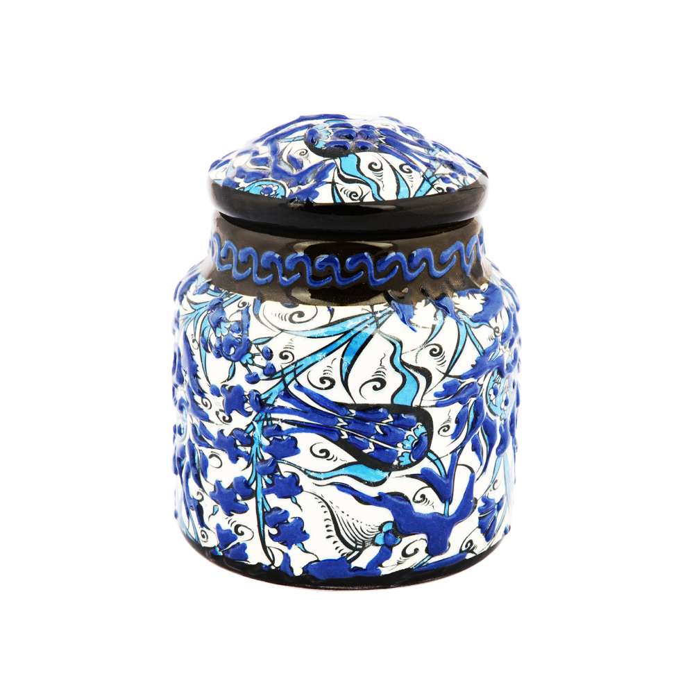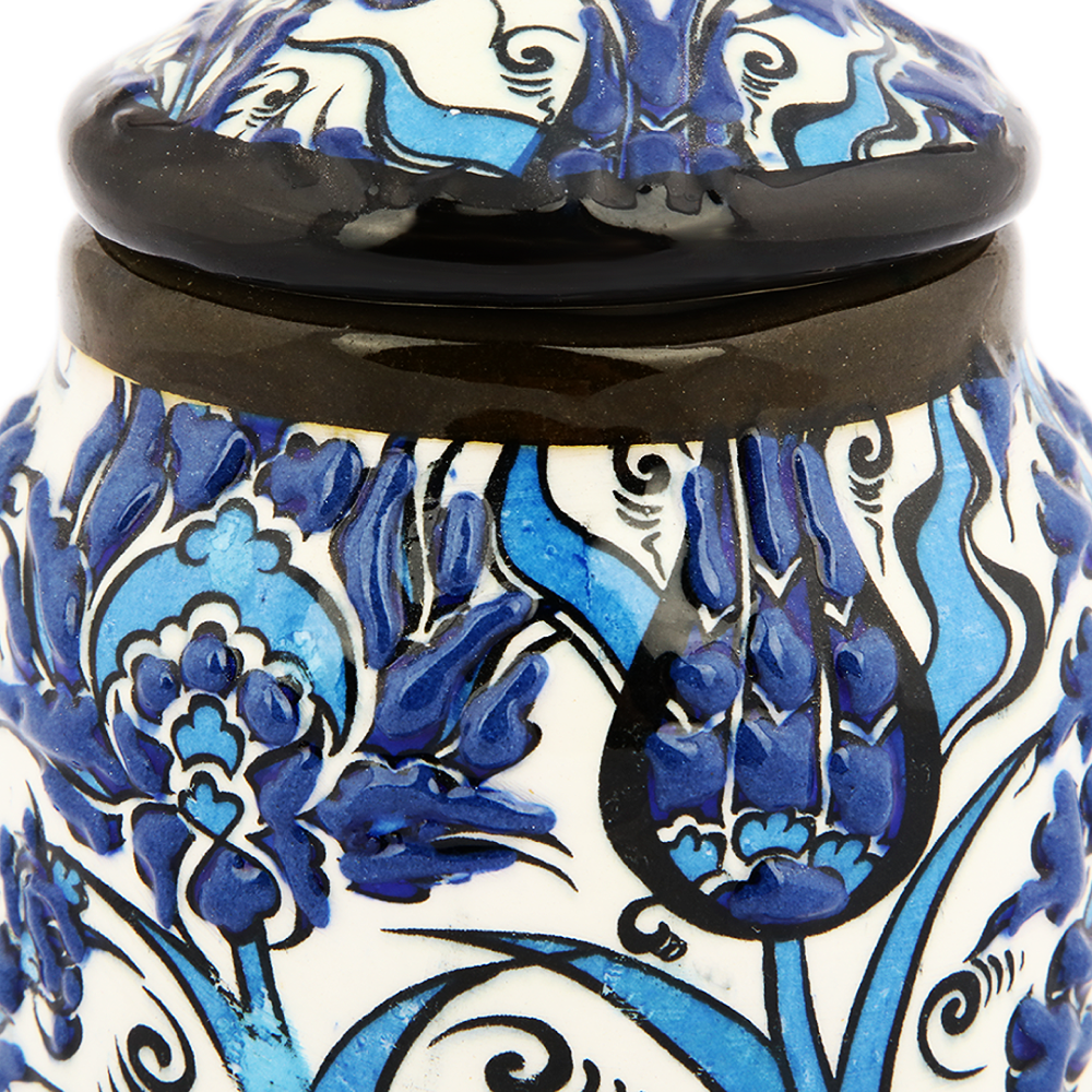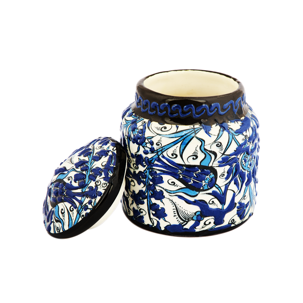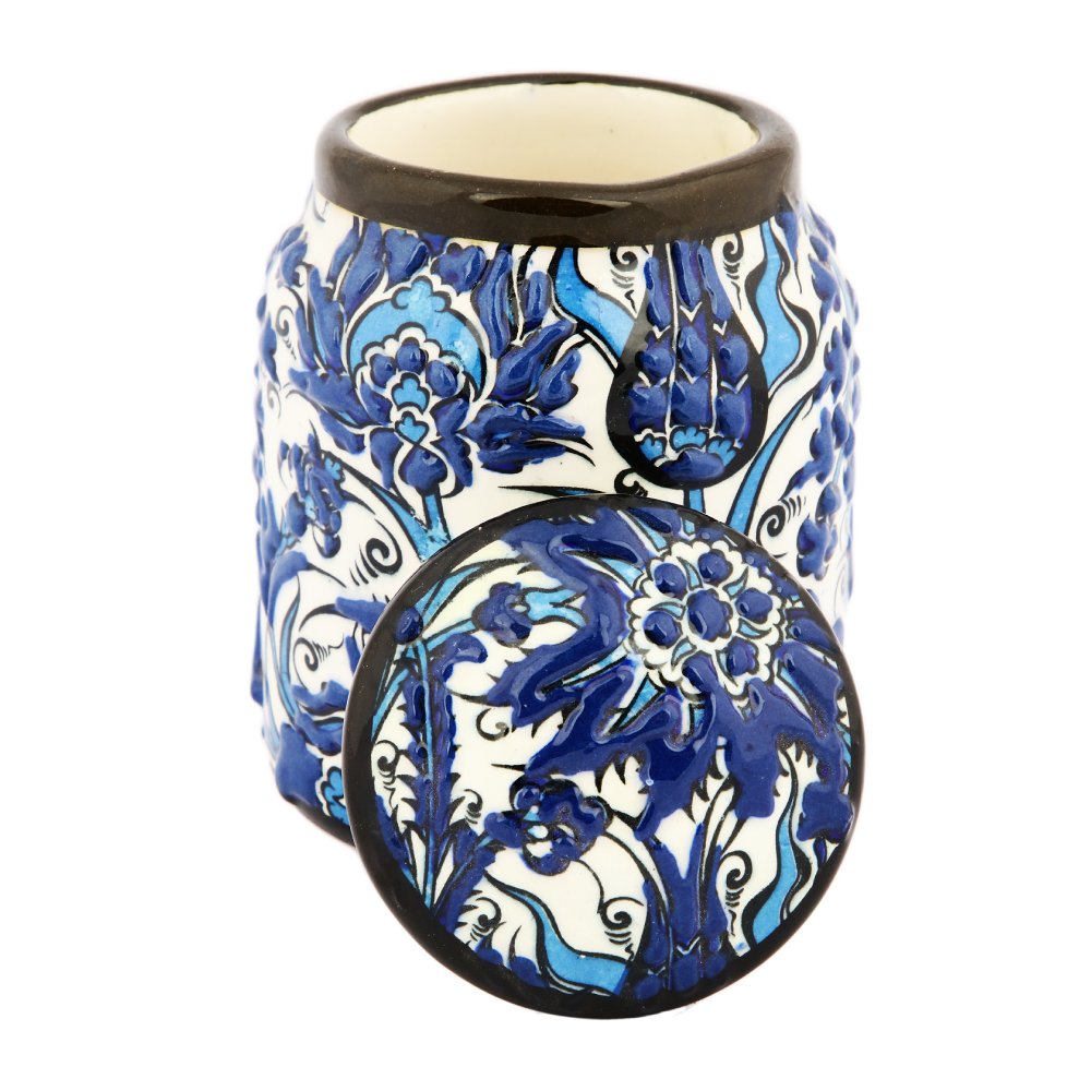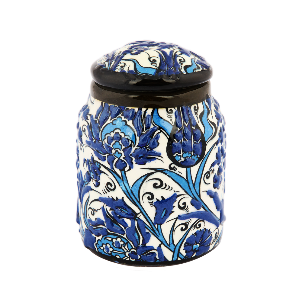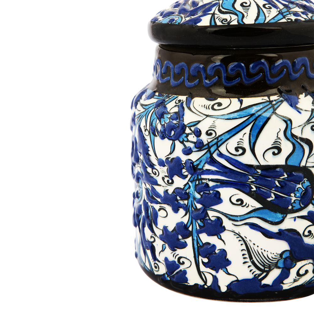 Unveil the elegance of our Handmade Embossed Ceramic Jar, a treasure trove of artisanship in rich cobalt blue. This jar is a homage to traditional craft, each detail hand-painted with an exquisite array of floral patt...