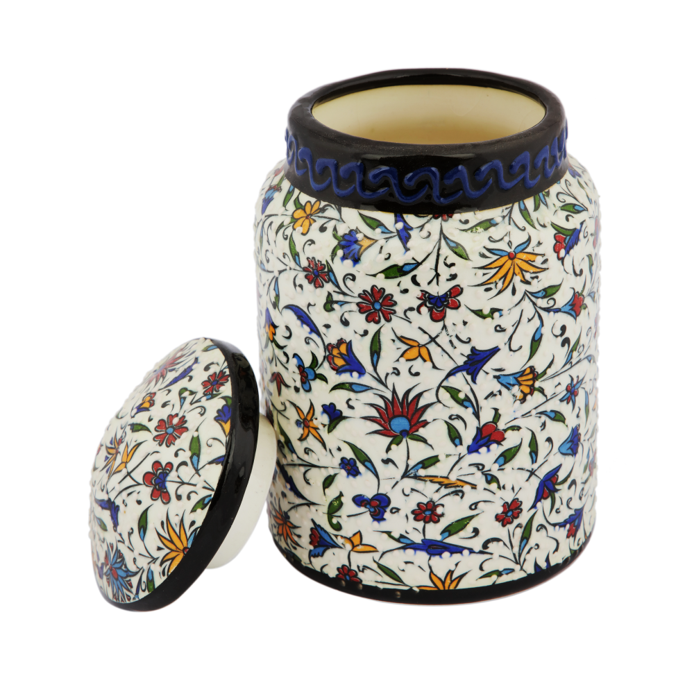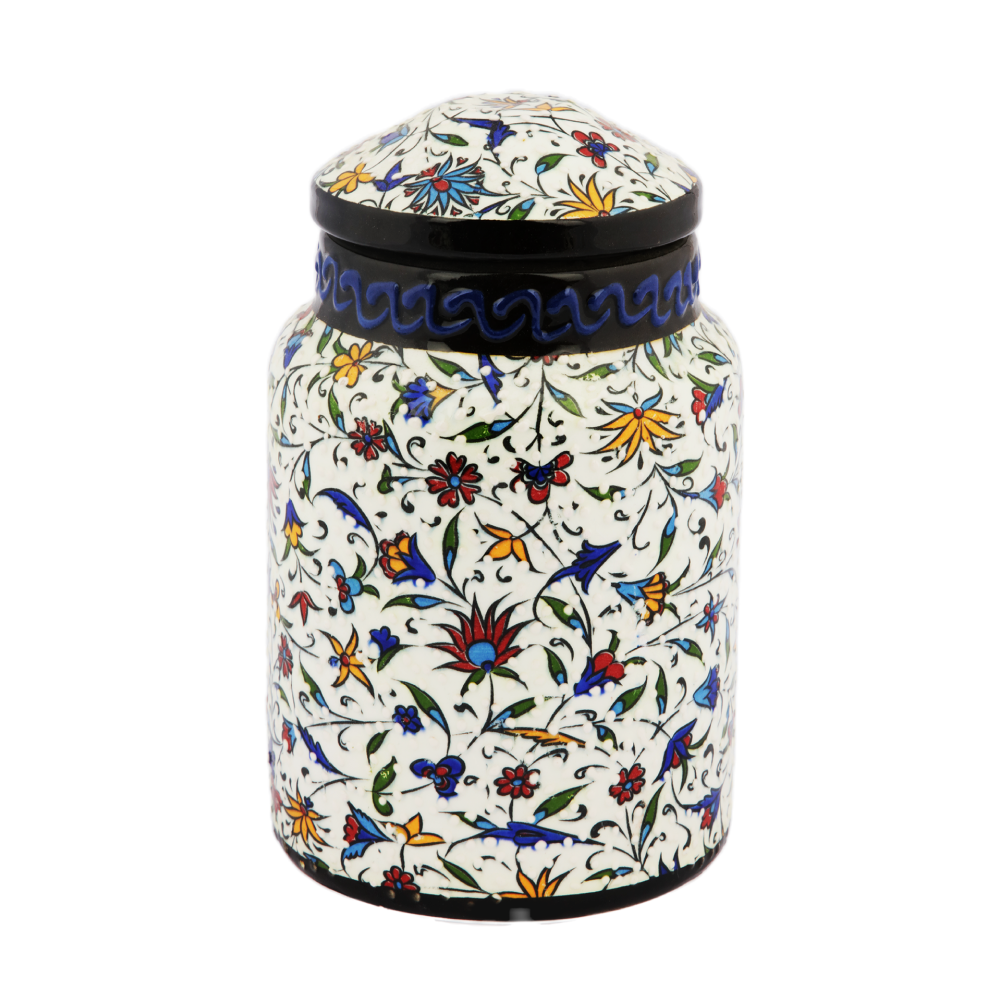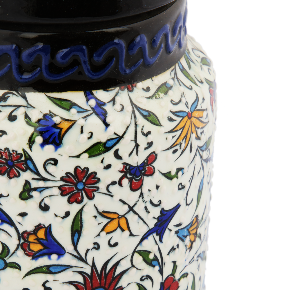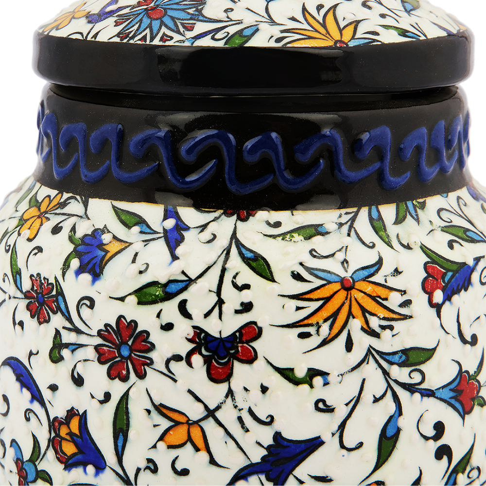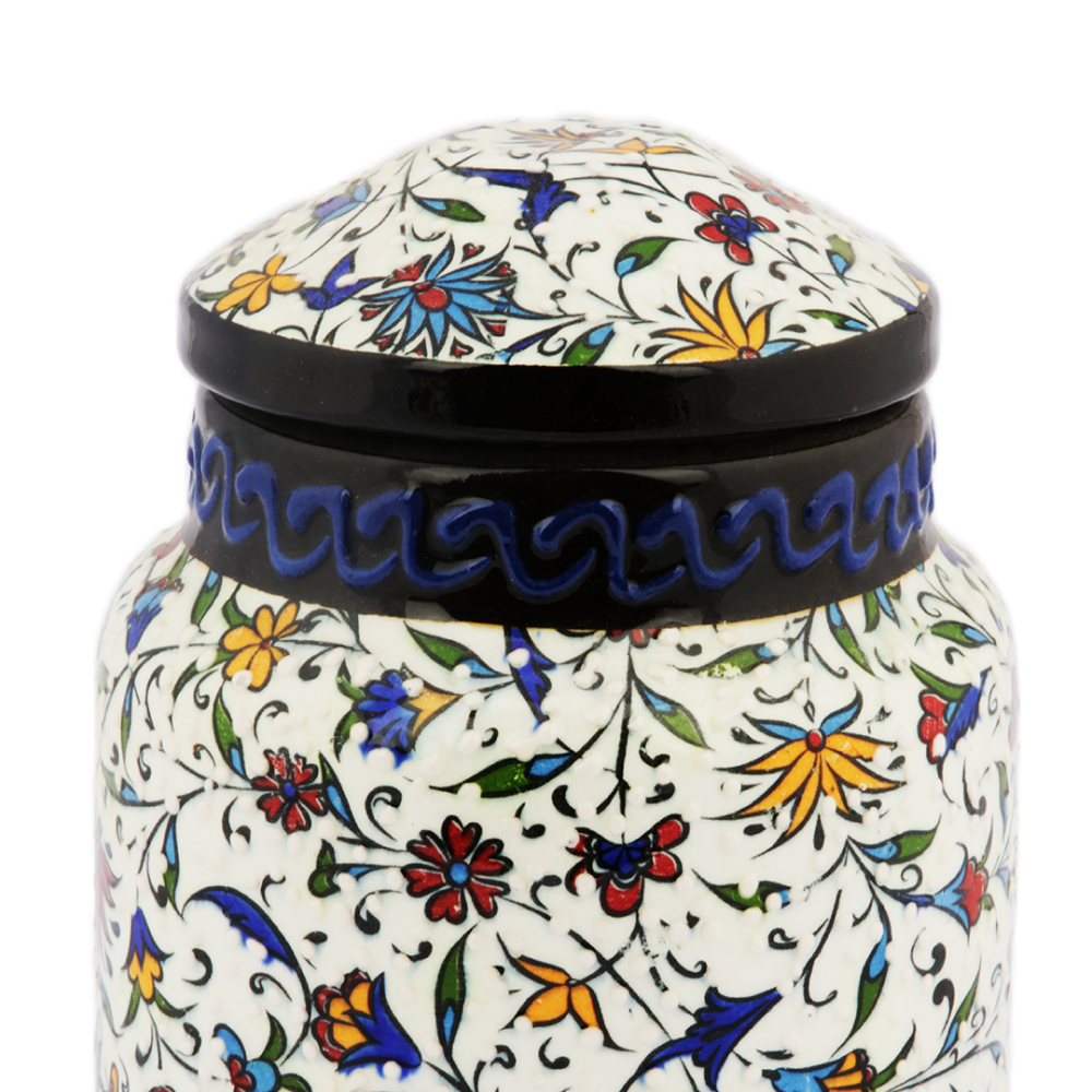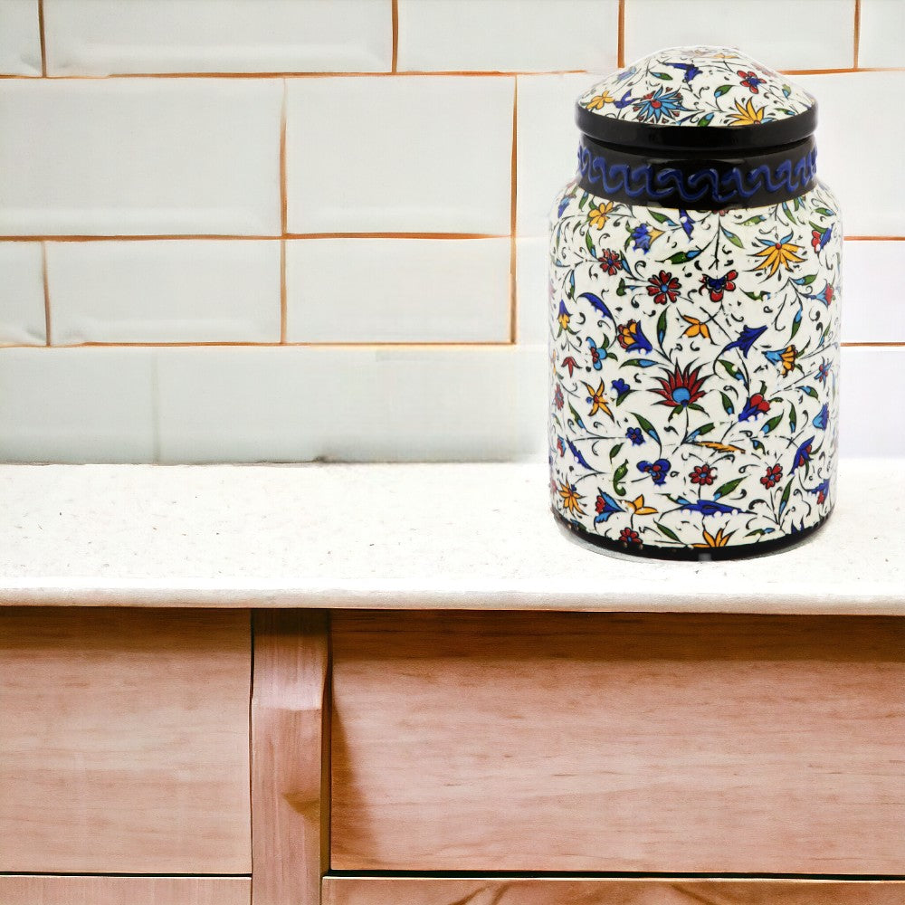 Step into a world of floral fantasy with our Handmade Multicolored Floral Ceramic Jar. Each jar is a kaleidoscope of artistry, its surface alive with an array of colorful flowers meticulously hand-painted against an i...
