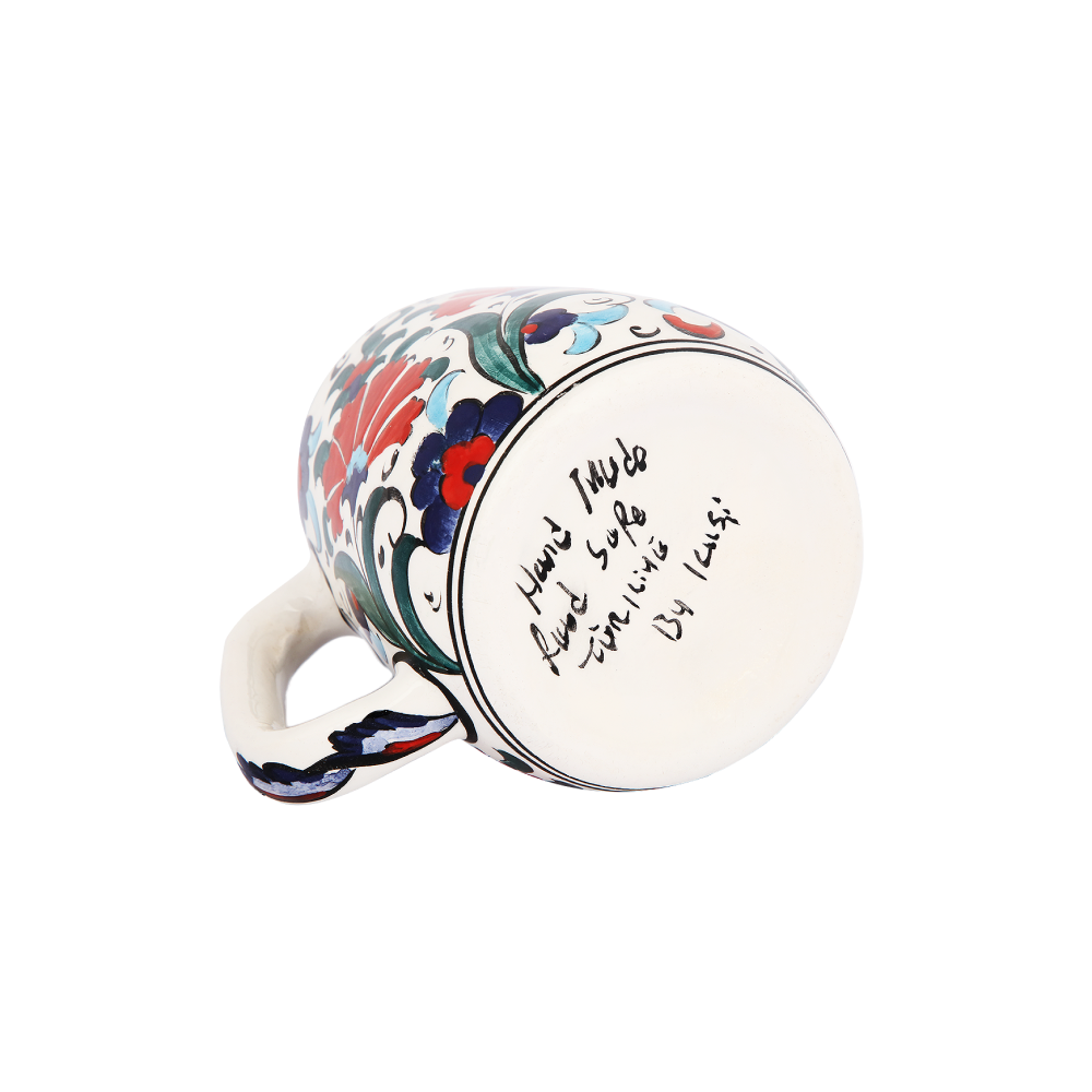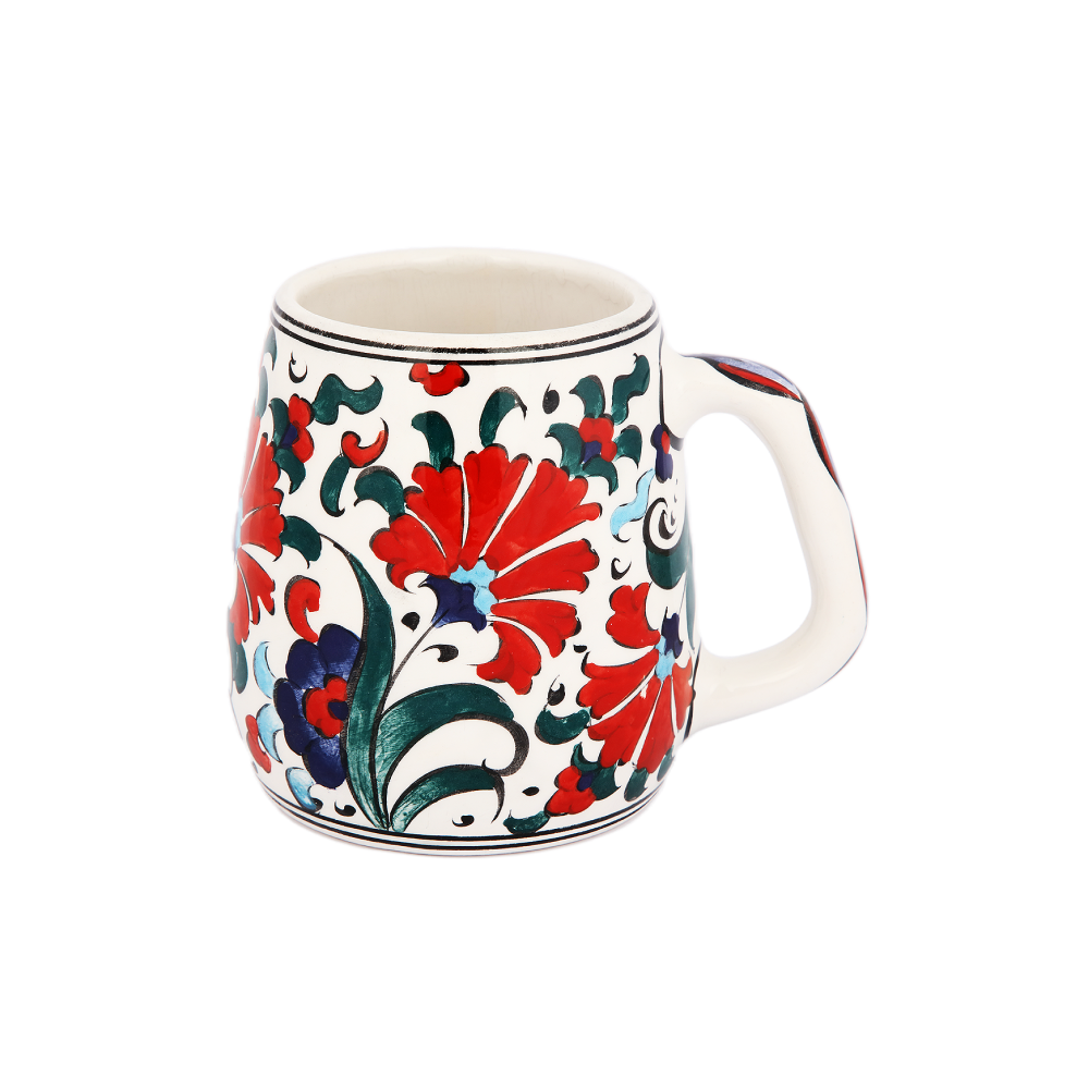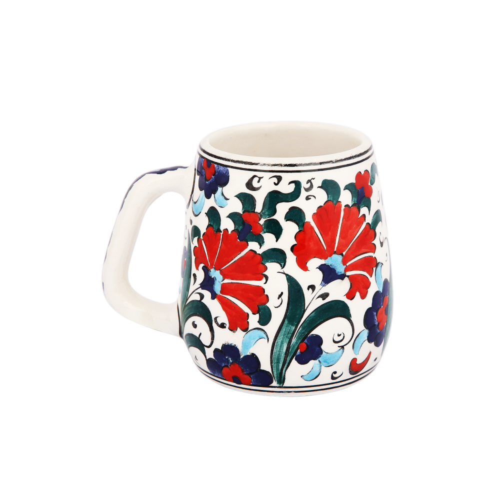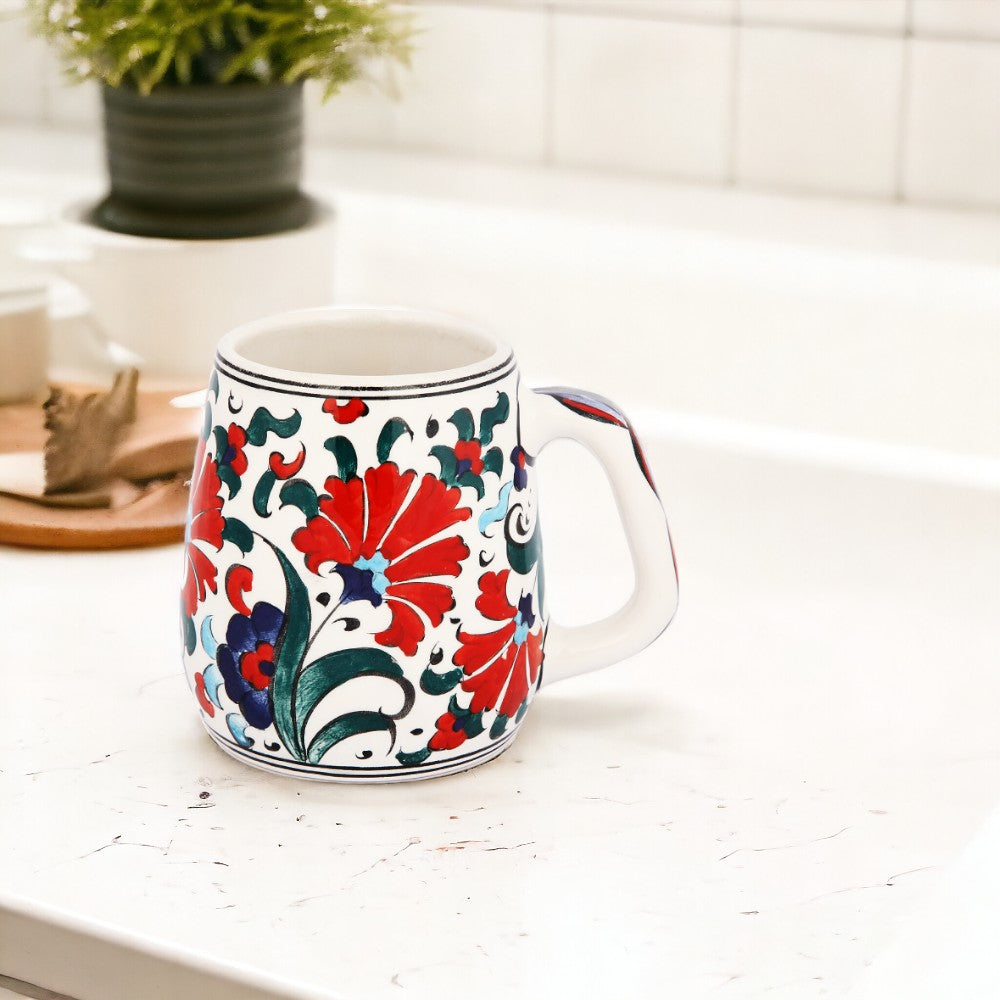 The "Crimson Cascade Handmade Ceramic Mug" boasts a bold pattern of red florals, accented with navy blue and touches of turquoise, evoking the splendor of a blossoming garden. Each mug, hand-painted with attention to ...