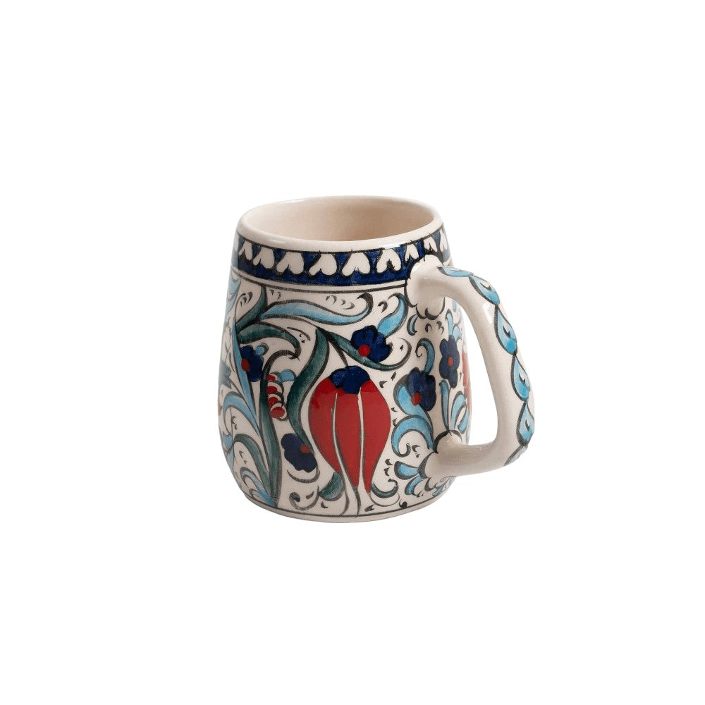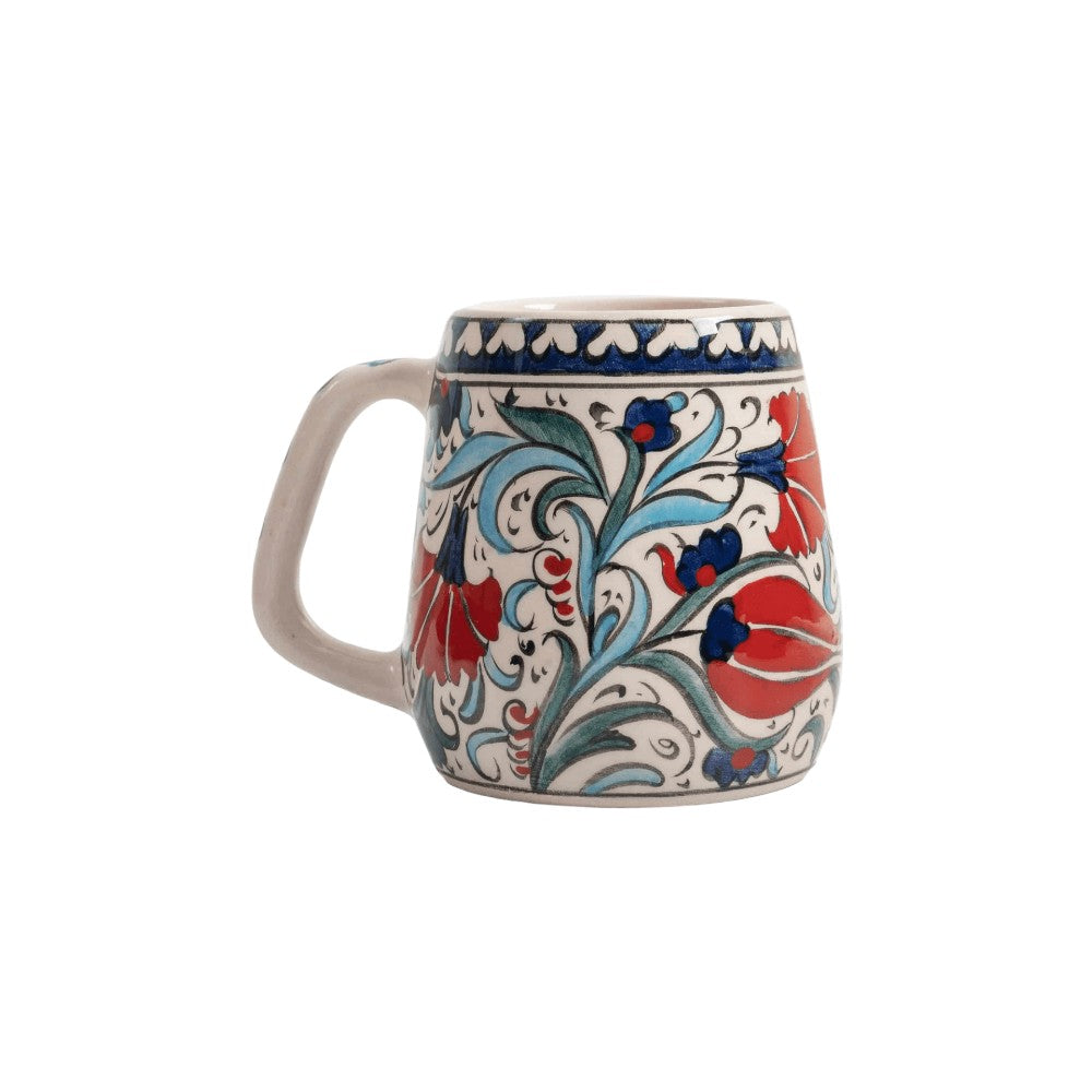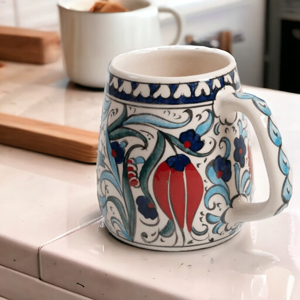 The "Crimson Tulip Handmade Ceramic Mug" showcases an exquisite red tulip pattern, accented by deep blue and soft turquoise, swirling elegantly around the mug. This piece is a testament to traditional craftsmanship, o...