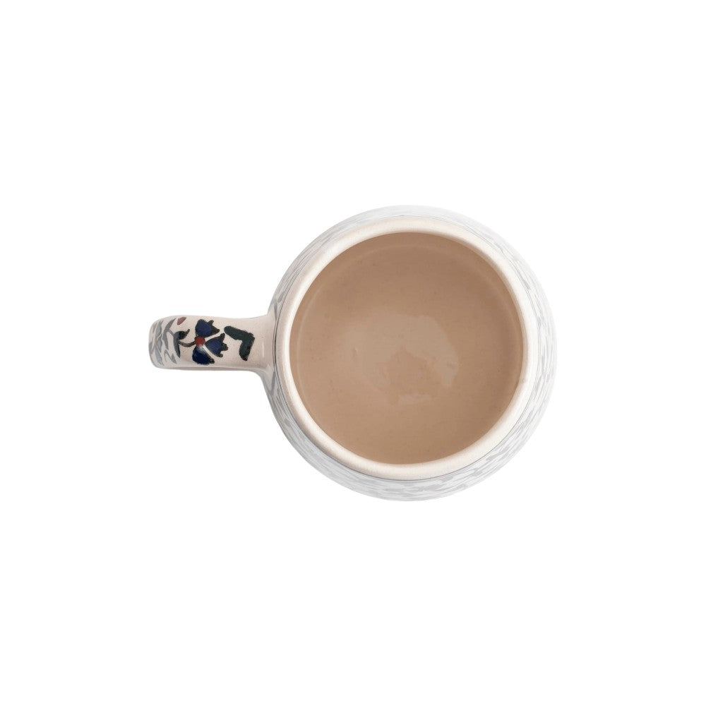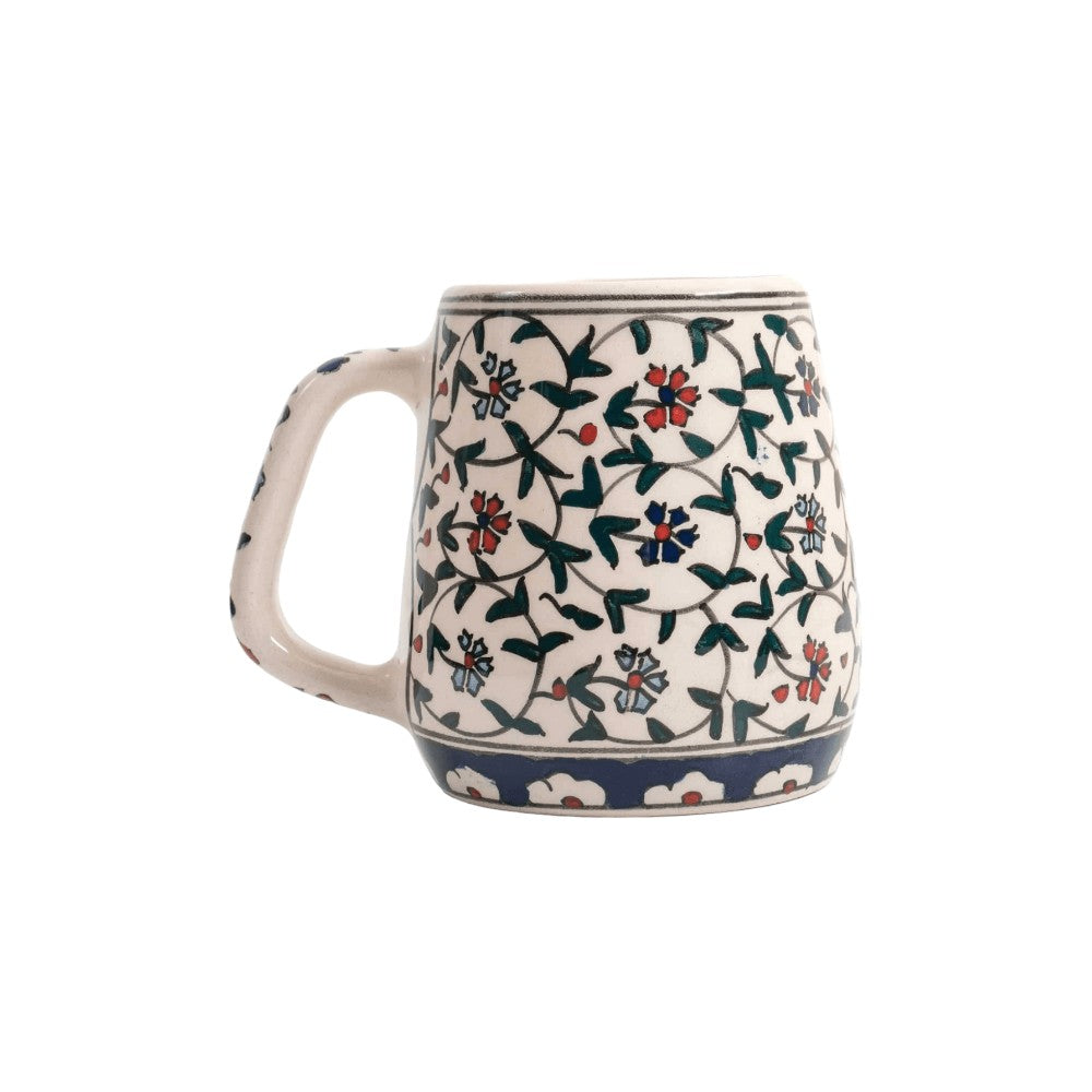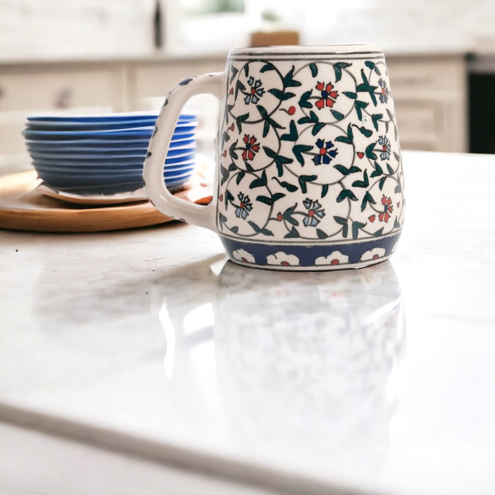 The "Garden Tapestry Handmade Ceramic Mug" is adorned with an intricate pattern of flowers and vines, reminiscent of a delicate tapestry. The blossoms in hues of red and blue, set against a pristine white background, ...