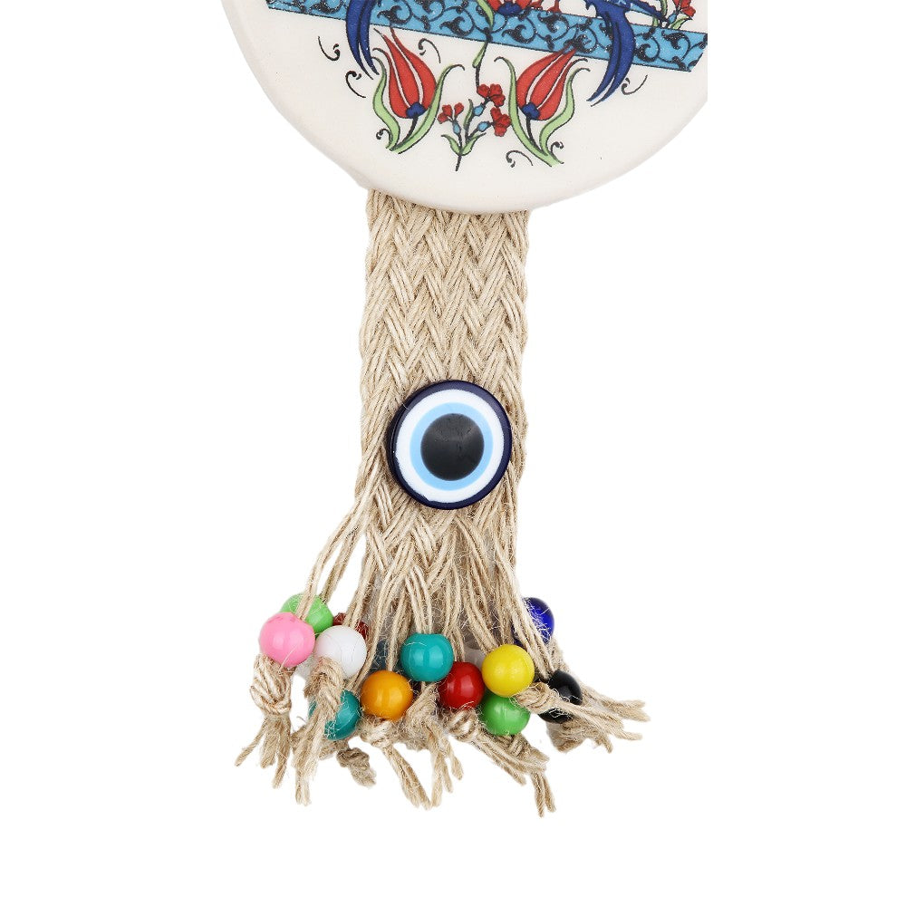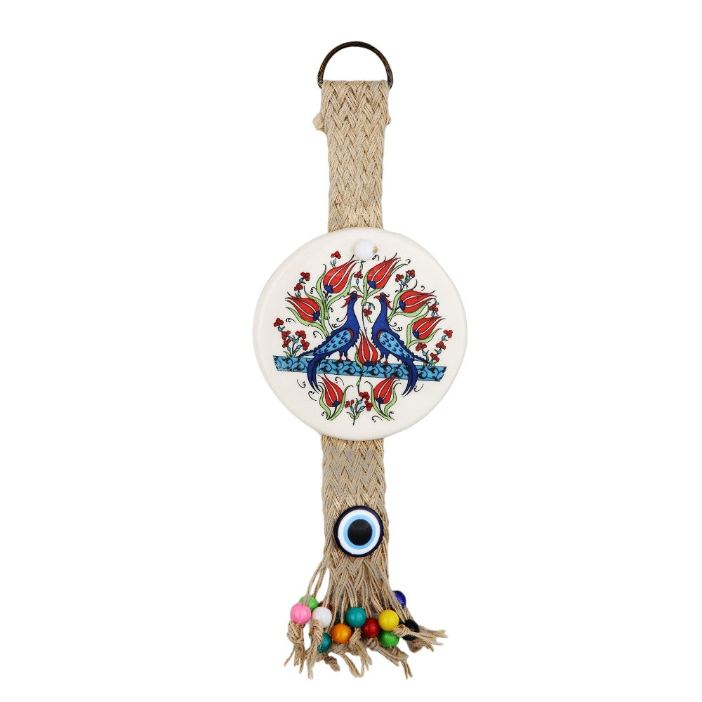 This is the "Mystical Peacock Medallion" – a ceramic hanging ornament that exudes elegance and cultural beauty. It is a circular disc elegantly painted with a pair of peacocks in vibrant blue and green hues, their plu...
