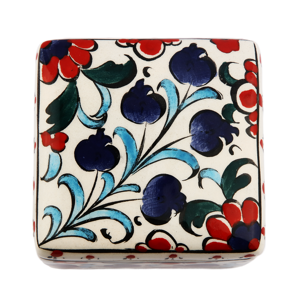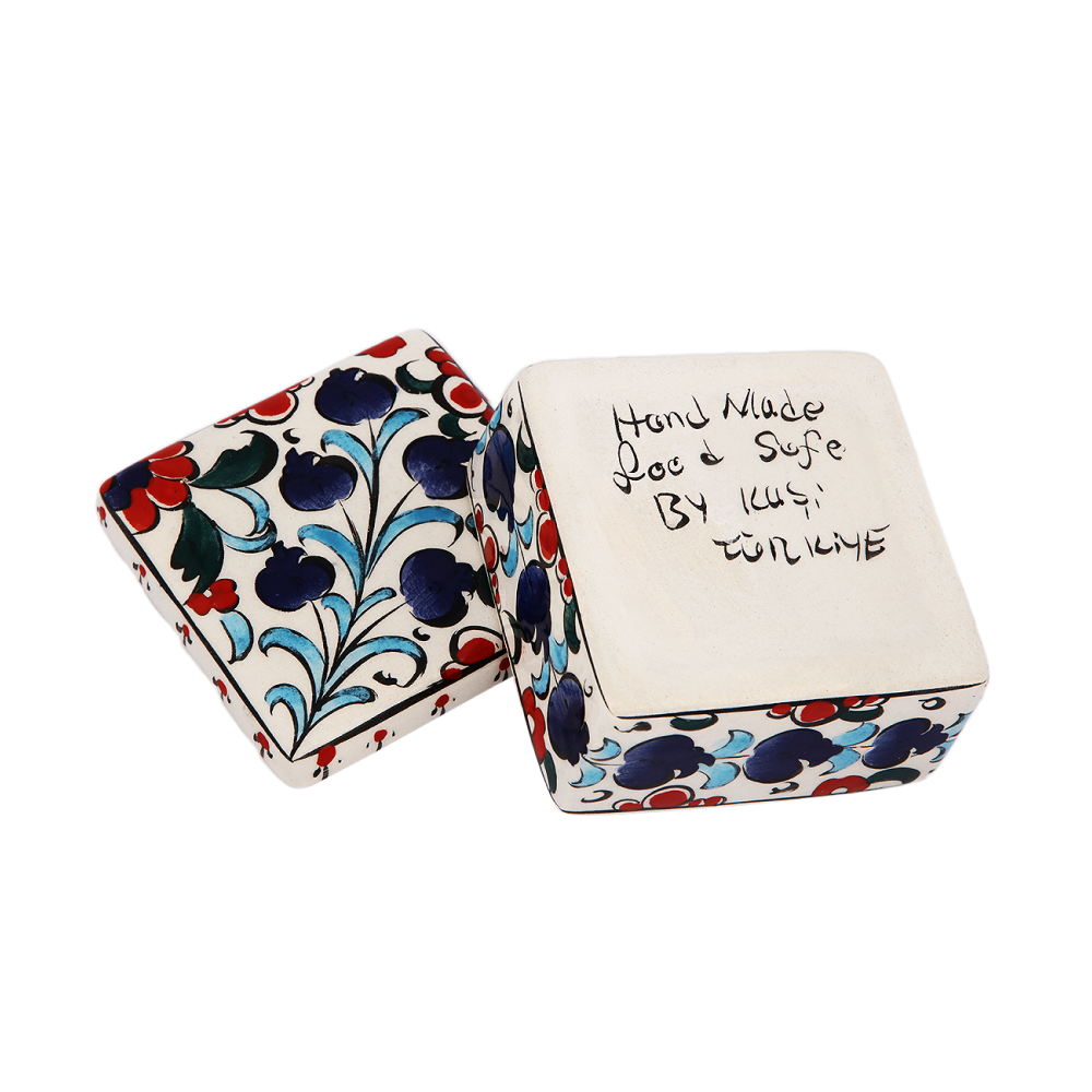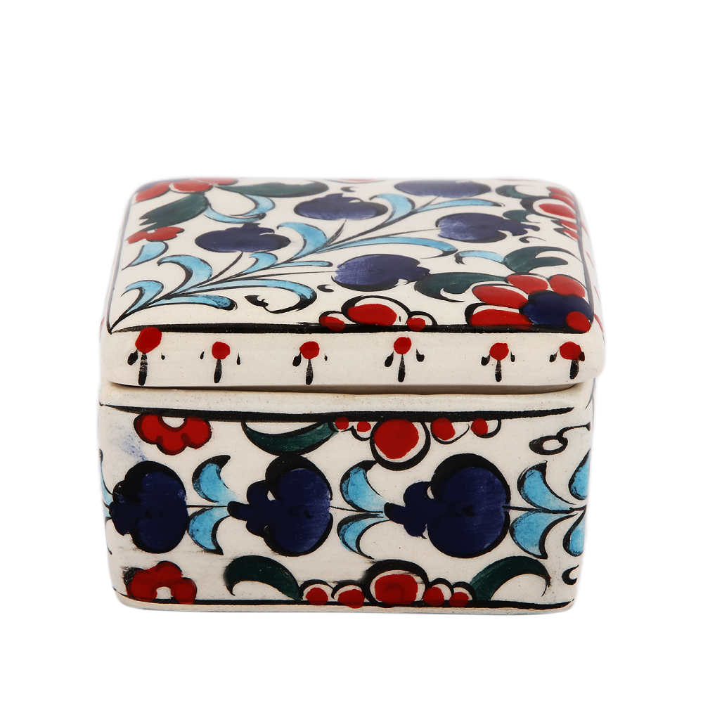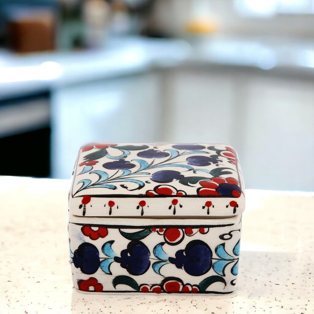 Introducing the 'Cerulean Harmony' Handmade Ceramic Trinket Box, a small square keepsake box that brings the artisan's touch to your treasures. The vibrant, hand-painted design features bold cerulean and deep navy flo...