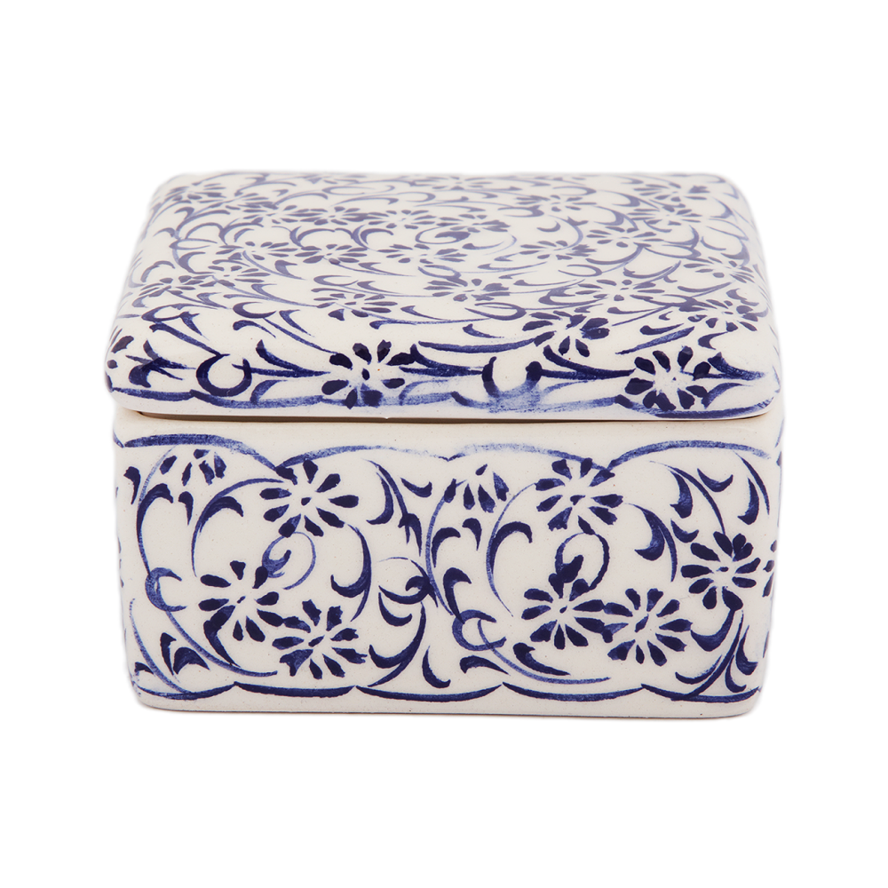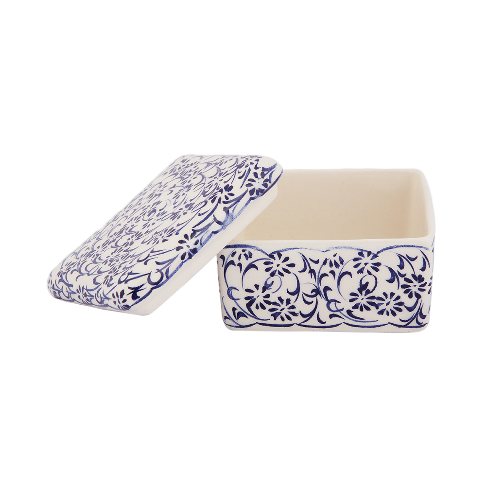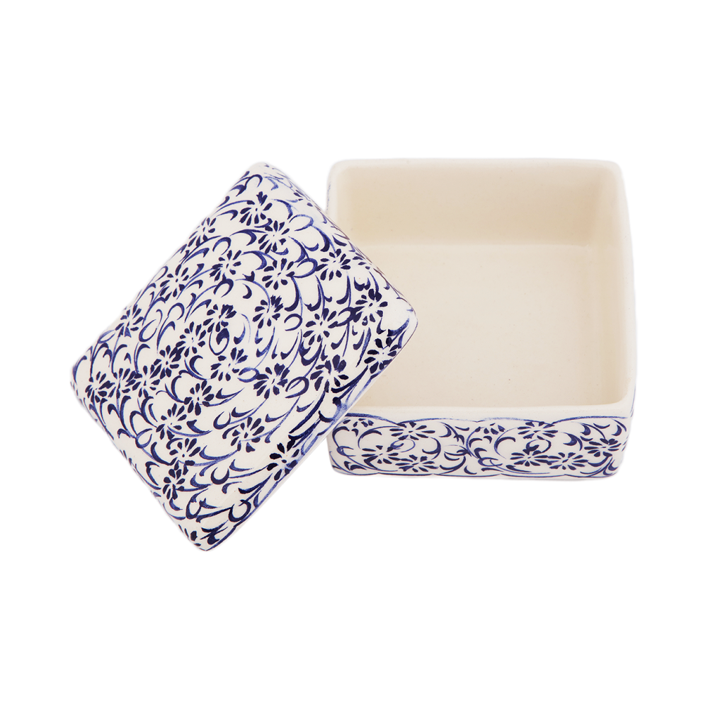 Behold the 'Indigo Lace' Handmade Ceramic Trinket Box, an embodiment of elegance in earthenware. The intricate, lace-like patterns in classic indigo blue are hand-painted with precision, encircling the box in a delica...